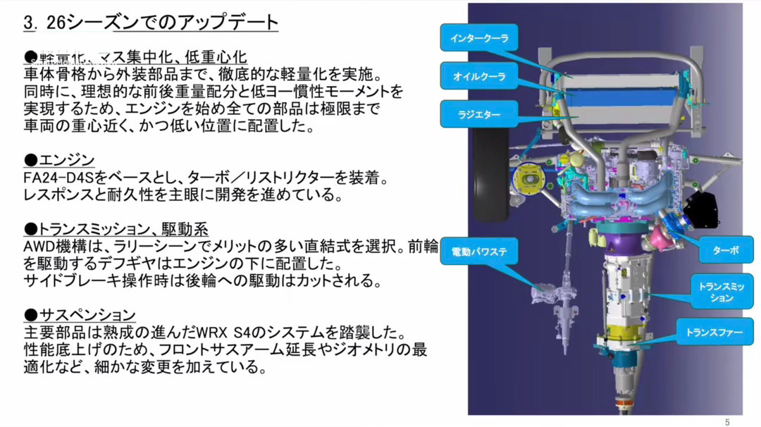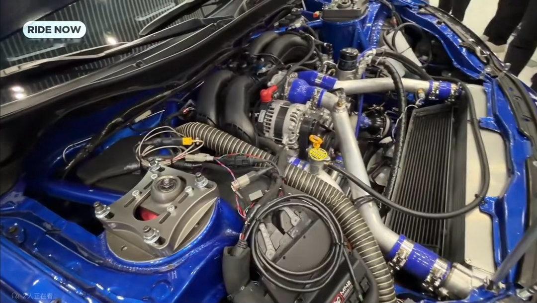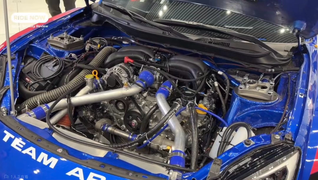 引擎用上了加了涡轮的FA24,扭距可以做到500Nm,功率因为BoP节流阀的原因大约维持在285匹。涡轮放在了量产EJ2x相同的位置涡轮管路也是类似。