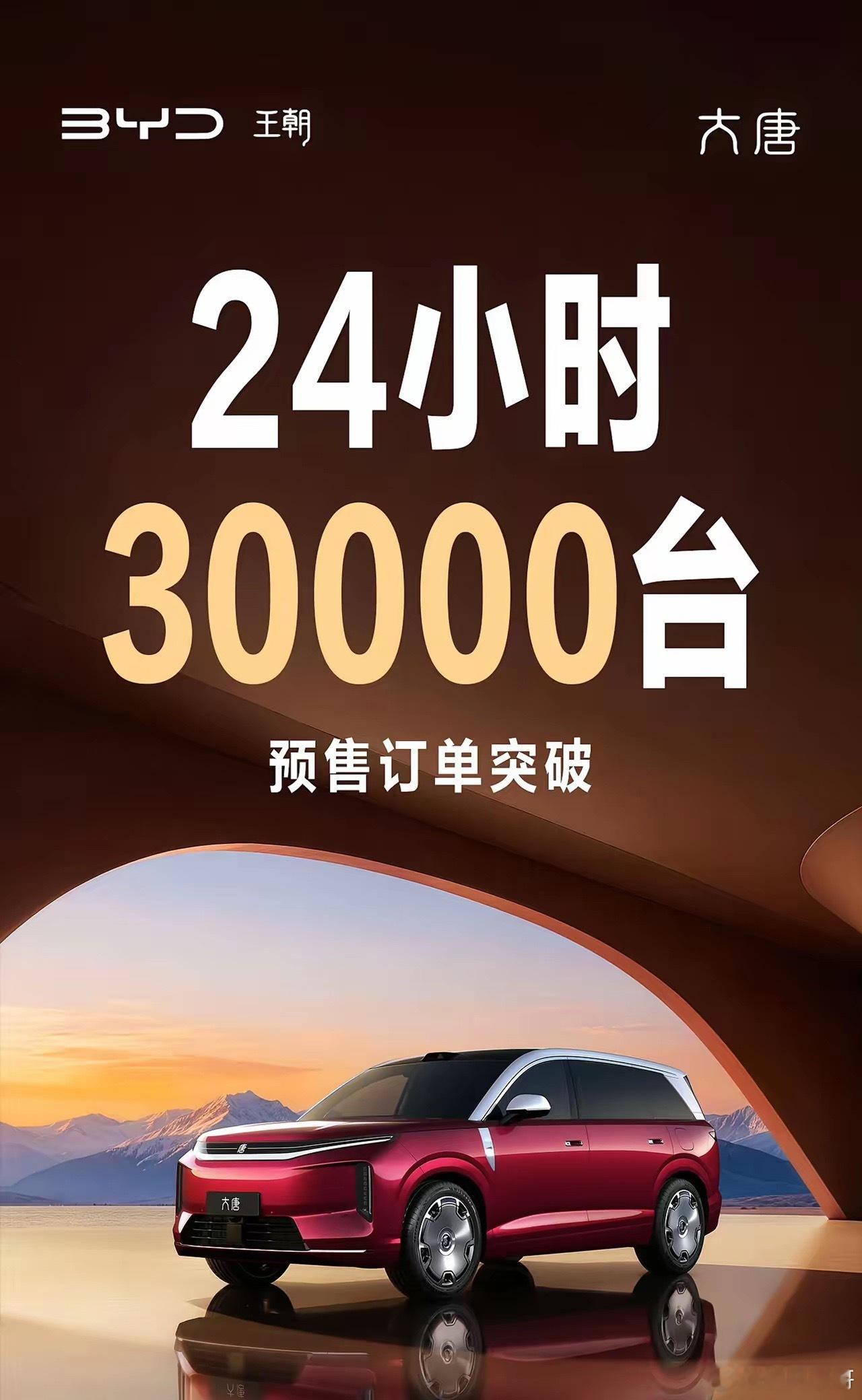 天塌了,比亚迪也有发布预售订单这一天了,比亚迪露天微博发来喜讯,24小时订单突破30000台,这是从来没有的事情,这种数据只见过问界,理想,小米这种新势力企业发布过,一发就是10万20万的预售量。比亚迪还是很少发这样的战况的,如今大唐发布,25万到30万,打爆了9系旗舰SUV的价格,如果正式上市价格还能再降2万,22.98万元或者23.98万元起,那绝对可以守住这30000的订单,并且扩大战绩。最后说一句比亚迪YYDS!!!
