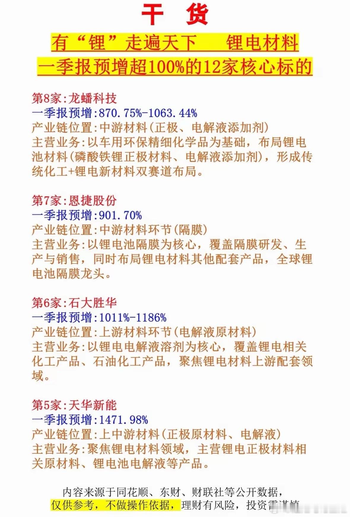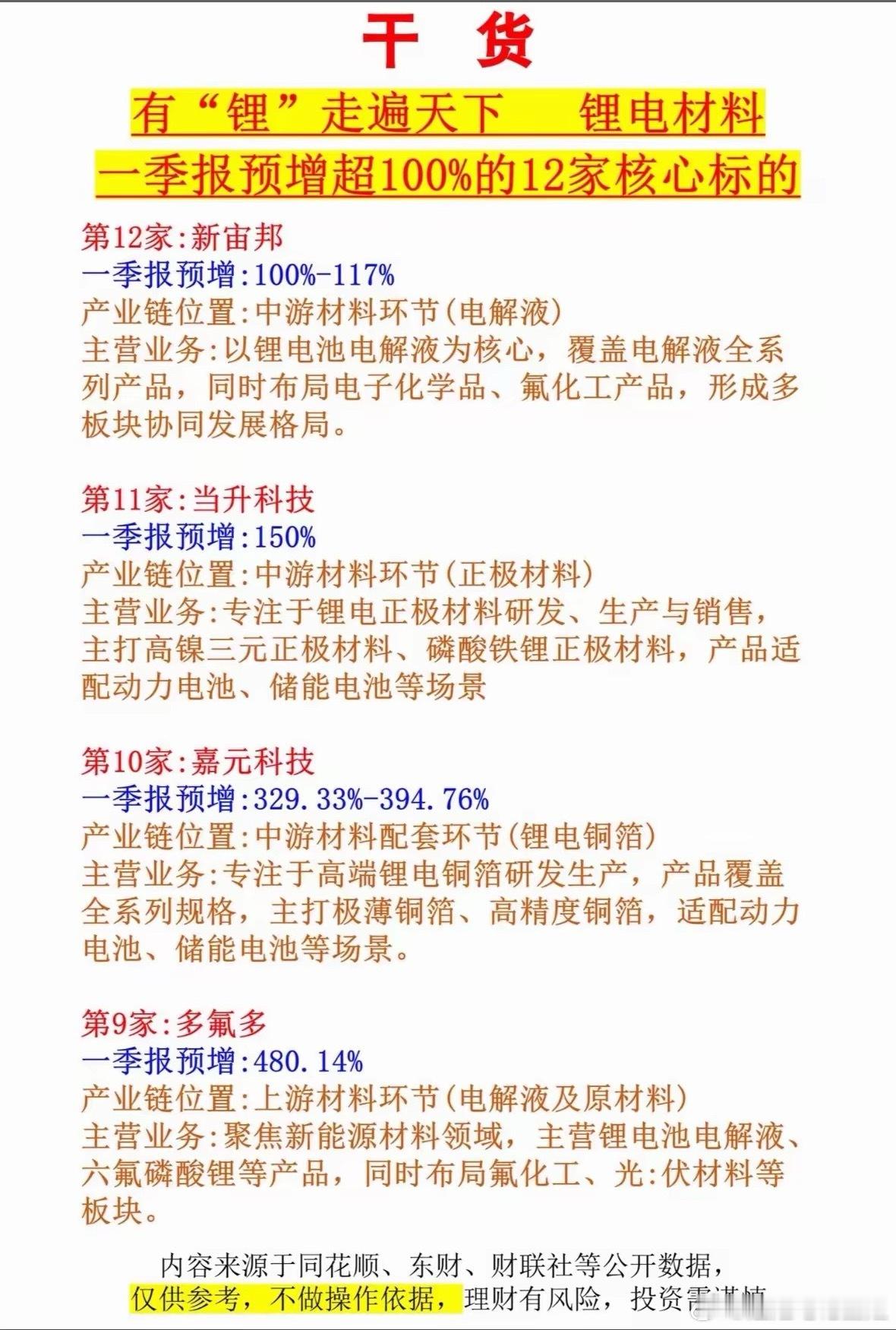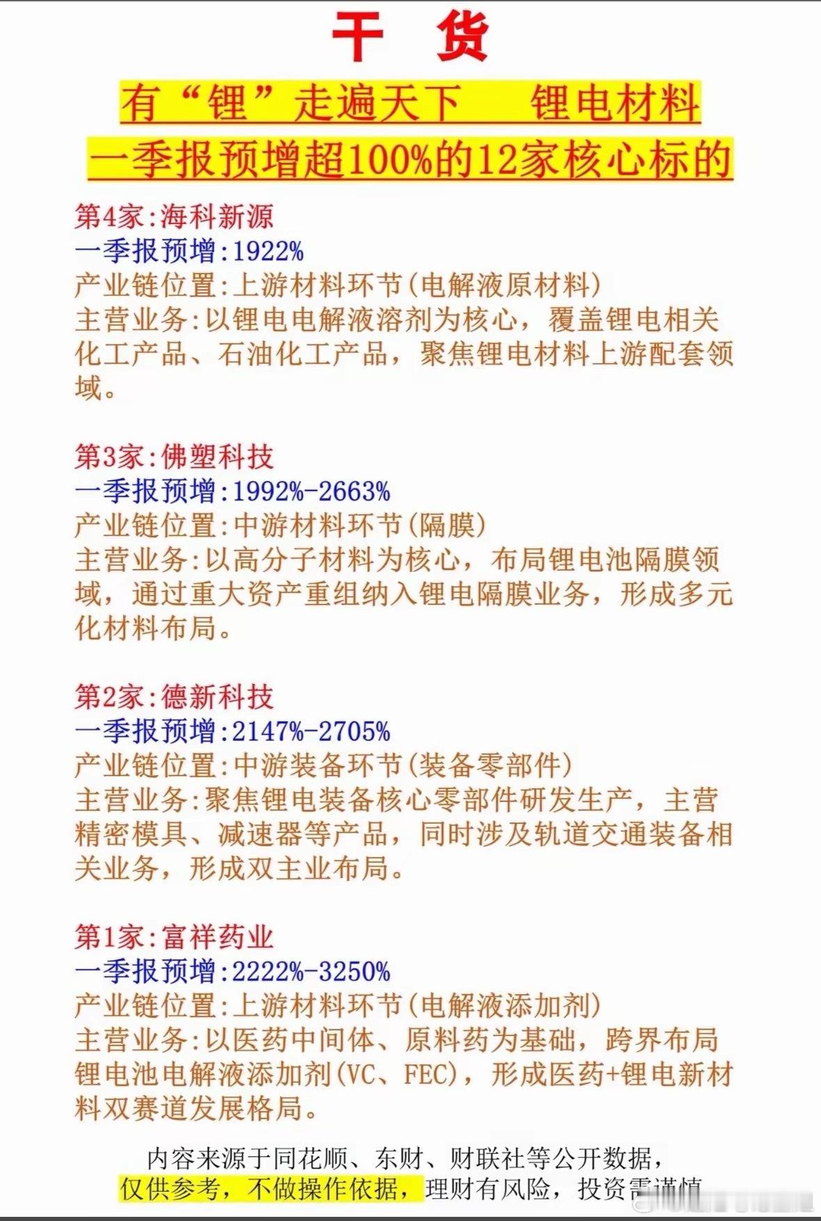 干货分享:锂电材料一季报预增超100%的12家核心标的2026年一季度,锂电圈直接炸锅!碳酸锂价格疯涨,4月24日电池级碳酸锂单日涨350元/吨,生意社数据显示10天涨8.28%。磷酸铁锂扩产超200亿,订单都排到下半年了。固态电池也从概念迈向量产。在这波红利下,有12家锂电材料公司一季报预增超100%。像中伟新材,一季度净利预增72.32% - 91.82%,三元正极材料全球出货领先,镍钴磷系材料卖爆,固态高镍前驱体技术落地快,固态材料出货超100吨。还有新宙邦,主营锂电池电解液,覆盖全系列,是国内电解液核心企业,聚焦动力电池、储能电池领域。这12家公司,个个都是锂电界的实力派!