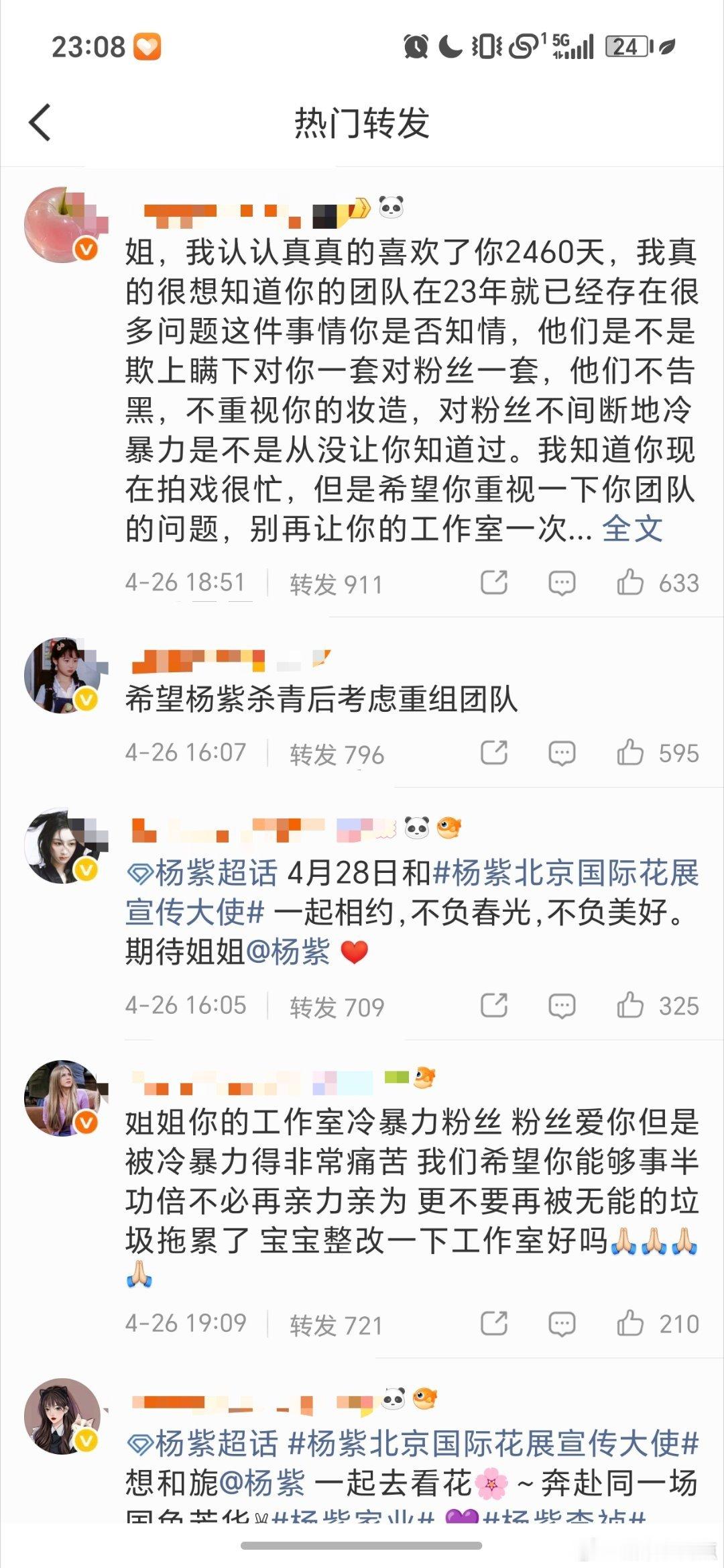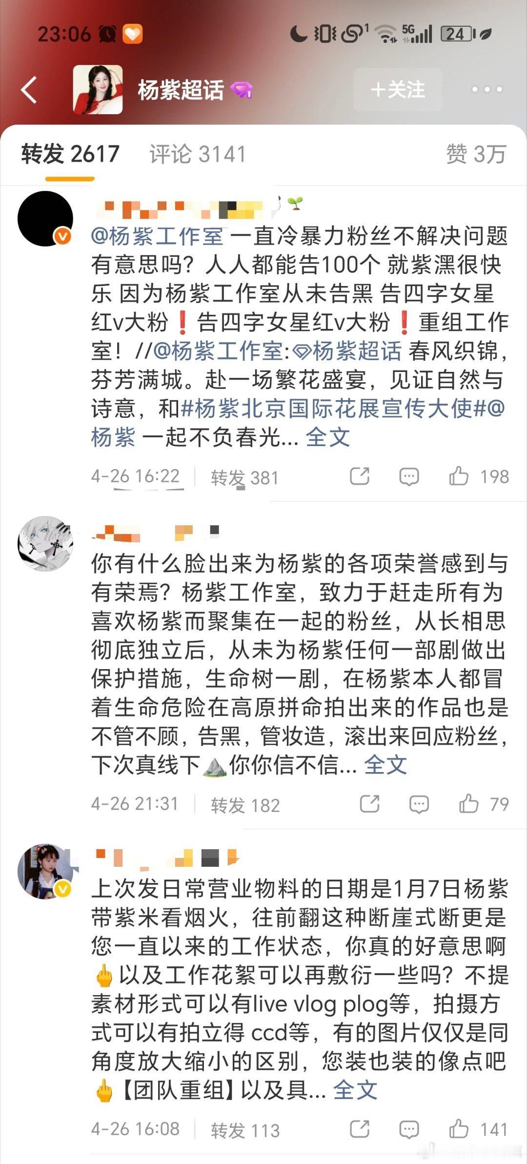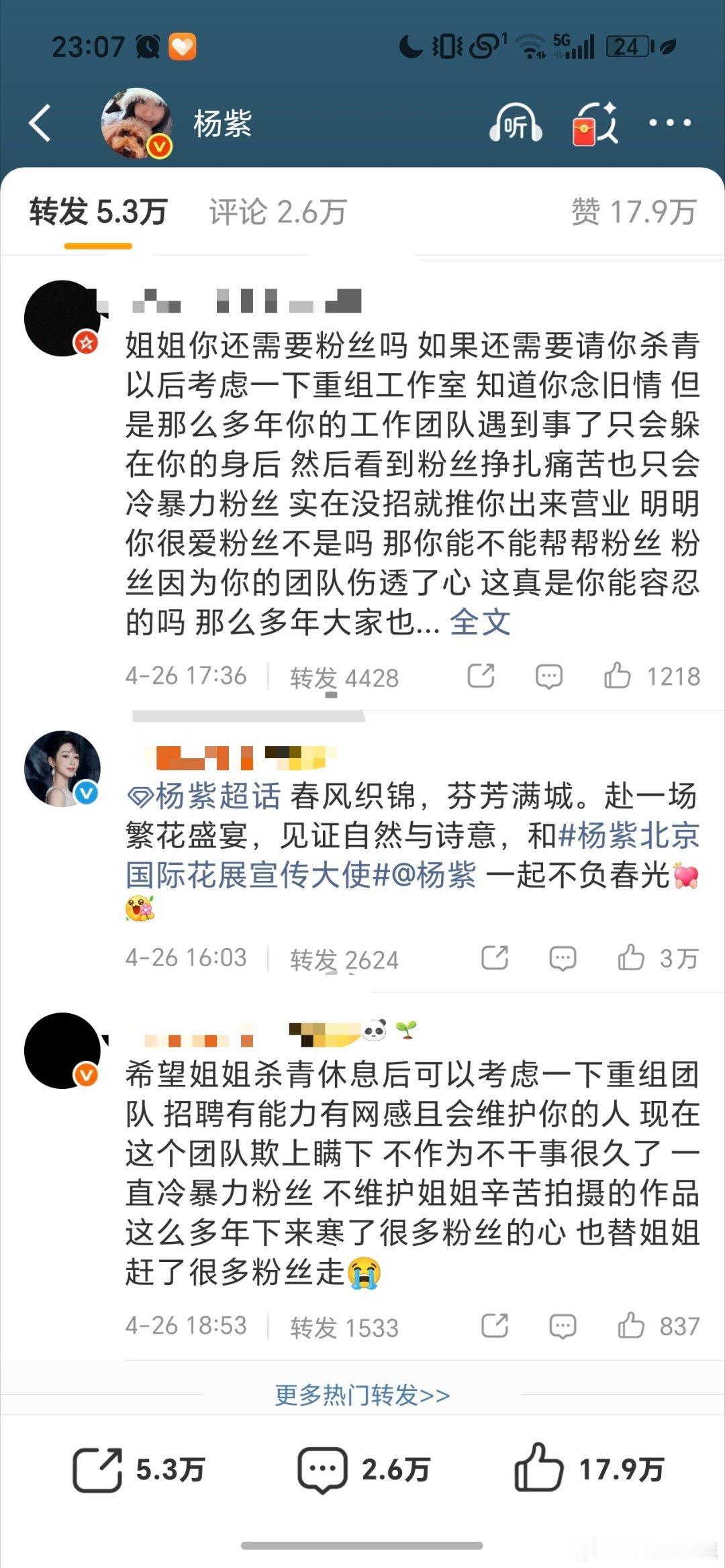 杨紫粉丝在杨紫和杨紫工作室下维权希望杨紫能别念旧情重组工作室团队 上次的事闹的确实挺大,但是杨紫人在剧组完全 wwzz,好多黑头像的粉丝 希望姐姐认真考虑吧😮💨