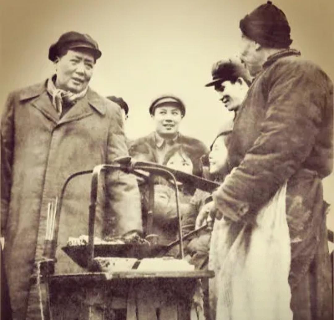 毛主席与卖臭豆腐的大爷聊天,还有几个孩子盯着毛主席看,一点没有架子。 这就是毛主席走进人民群众中间的真实写照,正在与一个卖臭豆腐的老大爷聊天。架子上应该是一根扁担,当时很多小商小贩挑着扁担做生意,那时间没有车子,全靠肩膀扛着。毛主席是湖南人,大家都知道湖南臭豆腐最出名,估计他们应该是老乡;因为毛主席的口音很重,这位卖臭豆腐的老大爷听得懂毛主席的话。 这张照片拍摄于1953年2月,从他们的穿着看得出,天气还比较寒冷。地点在武昌蛇山的半山腰的位置,这时候蛇山游人往来,烟火气十足,路边的小吃摊点也成了也成了一道别致的风景。并没有因为毛主席的到来,影响到大家的正常生活,满是平凡生活的气息。毛主席停下脚步,和一位卖炸臭豆腐的老大爷聊起了家常。 照片里的毛主席没有丝毫的架子,脸上满是和蔼与亲切,神情温和又自然,与普通游客没啥两样。毛主席在与这位卖臭豆腐老大爷交谈时,还有一群孩子围了上来,大家伸着脑袋看毛主席。估计做梦也没有想到,能如此近距离地见到毛主席,脸上藏不住的开心,这样难得的相遇,注定会成为他们一辈子都忘不了的记忆。 臭豆腐气味浓烈,炸制时又烟熏火燎,很多人遇到这样的小吃摊,对于那些不喜欢吃臭豆腐的人来说,下意识地会躲开。可毛主席不一样,他向来喜爱这道百姓爱吃的寻常小吃,更没有嫌弃小摊的简陋。在和老大爷聊天时,他没有聊宏大的话题,而是实实在在关心起老人的生计,仔细询问生意好不好做、一天能有多少收入,句句都问到了老百姓的心坎里。 毛主席始终站在群众中间,和普通百姓面对面谈心,倾听他们的生活琐事,关心他们的衣食冷暖。老百姓的日常喜好,他感同身受;老百姓的生活难处,他放在心上;老百姓憎恶的事情,他同样坚决反对。 这就是毛主席最动人的地气,他始终把自己当成人民的一员,从不脱离群众,始终和百姓心贴心。没有刻意的姿态,没有疏远的距离,只是用最朴素、最真诚的方式,和群众打成一片。这份扎根人民、心系百姓的初心,这份平易近人、亲民爱民的本色,让我们永远铭记,也让我们深深懂得,毛主席与人民始终血脉相连、心意相通。