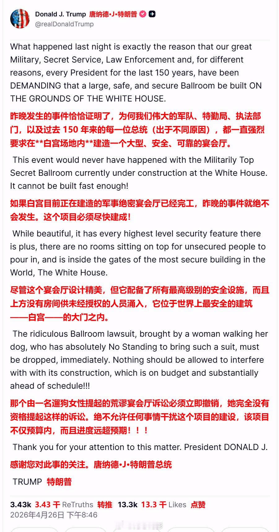 特朗普刚刚发帖,回顾昨晚白宫记者协会晚宴枪击案,再次重复他的结论:“我就说该修园子吧!没有人能阻拦我修园子!”