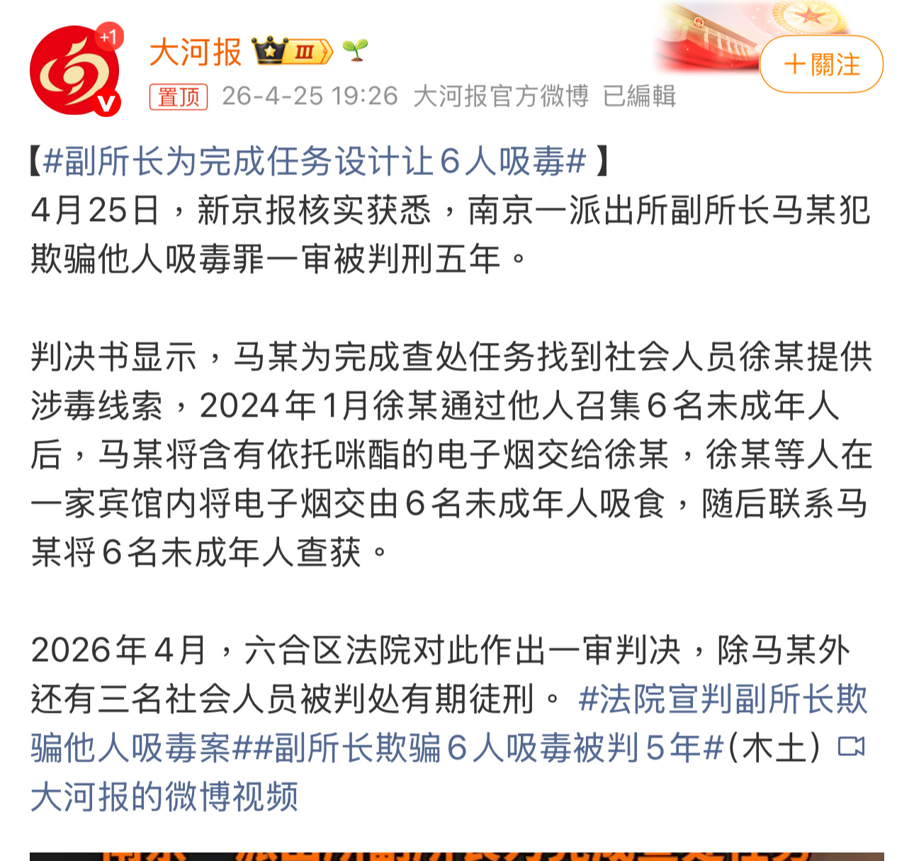 江苏南京派出所副所长为完成查处任务,通过社会人员诱使6名未成年人吸毒,再将他们查获。