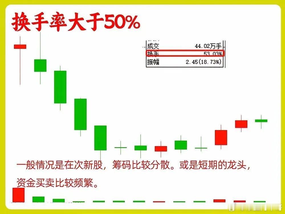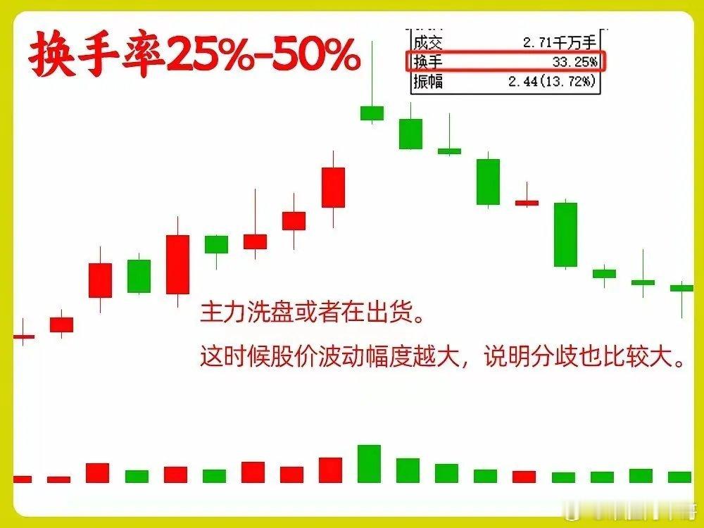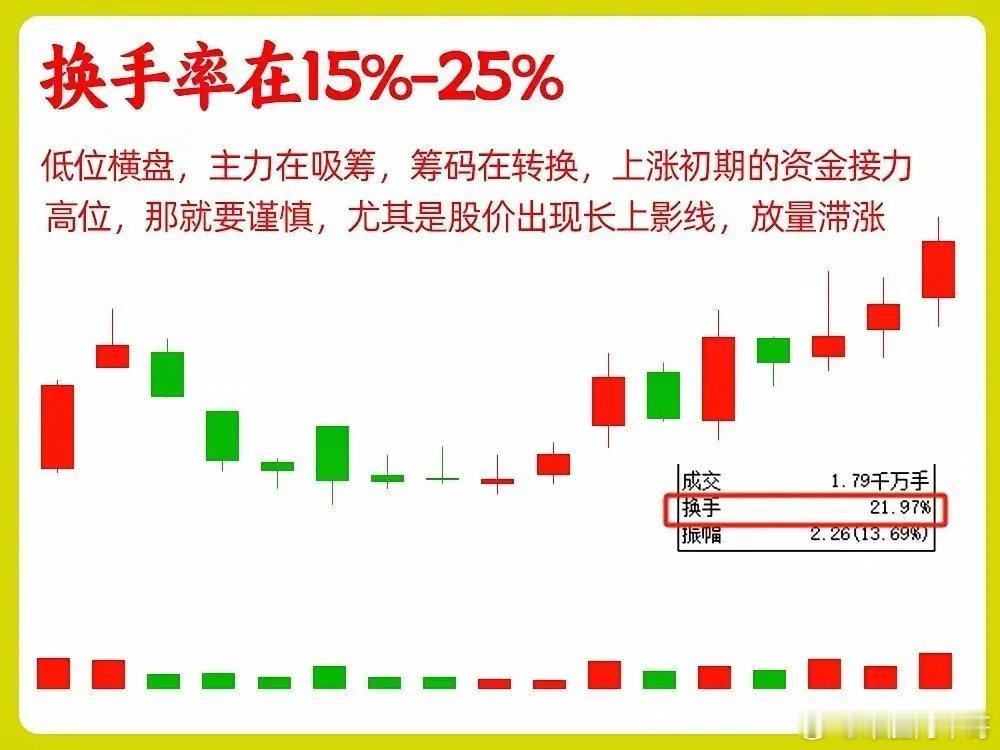 5年炒股感悟:周K线换手率看穿主力,避开90%的坑做中长期投资总被主力骗?其实就看周K线换手率!这是我真金白银砸出来的经验,不用天天盯盘,每周5分钟就能辨吸筹和出货。1. <15%(中小盘)/<5%(大蓝筹):资金无人问津,筹码僵死,别浪费时间,果断换赛道。2. 15%-25%(中小盘)/5%-15%(大蓝筹):黄金区间!低位是主力吸筹,高位放量不涨就是出货。3. 25%-50%(中小盘)/15%-30%(大蓝筹):多空博弈白热化,高位出现赶紧减仓,别当接盘侠。4. >50%(中小盘)/>30%(大蓝筹):筹码一天一换,纯靠情绪炒作,中长期坚决不碰。1. 市值不同标准不同:大蓝筹5%换手算活跃,中小盘得15%以上才够看。2. 位置比数值重要10倍:同样30%换手,低位是机会,高位就是风险。炒股最忌瞎跟风,看懂周换手,就能避开主力的诱多诱空。这都是实战踩坑的感悟,没用复杂公式,新手也能看懂。风险提示:本文仅为个人实战感悟,不构成投资建议,股市有风险,投资需谨慎。