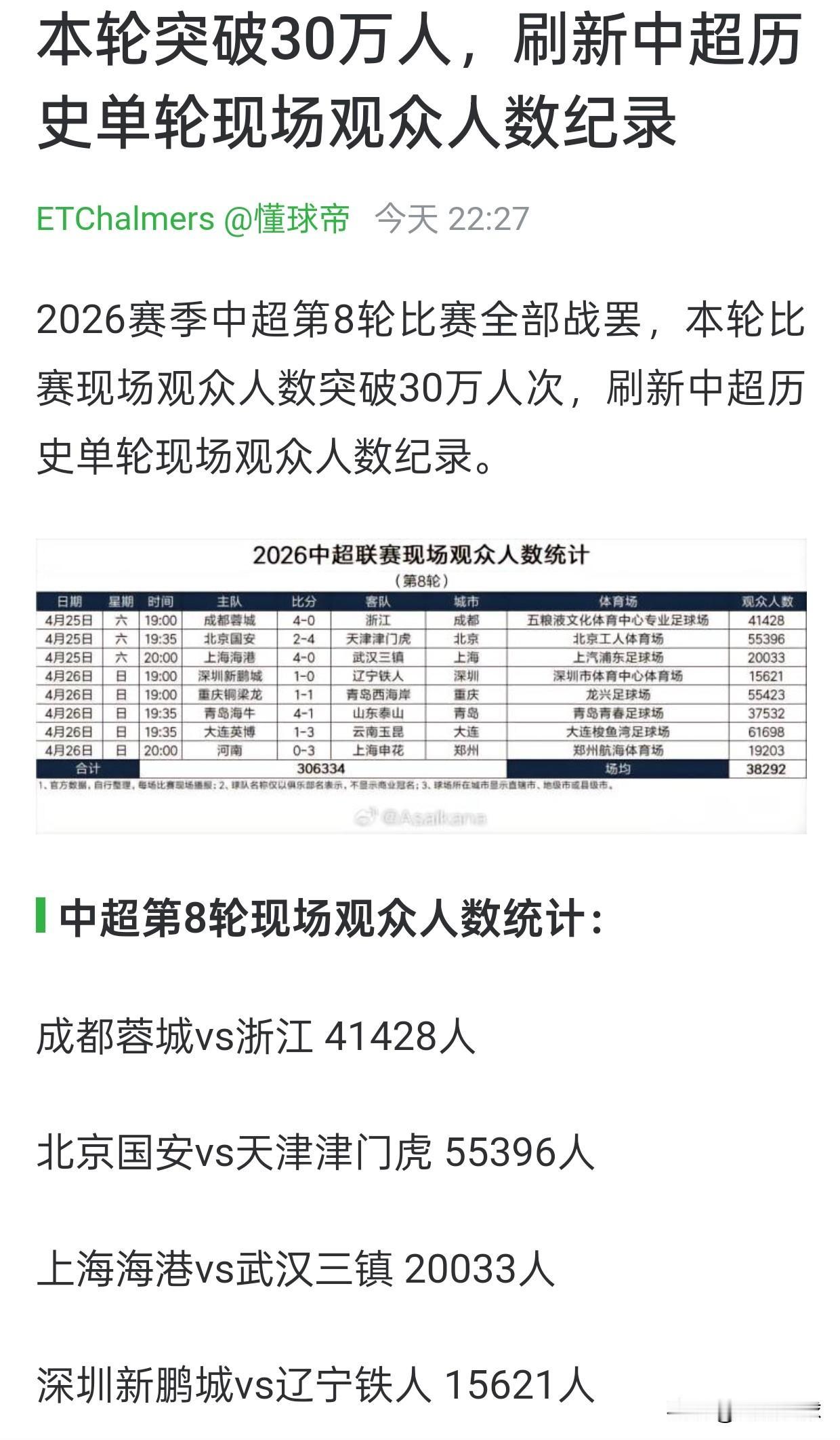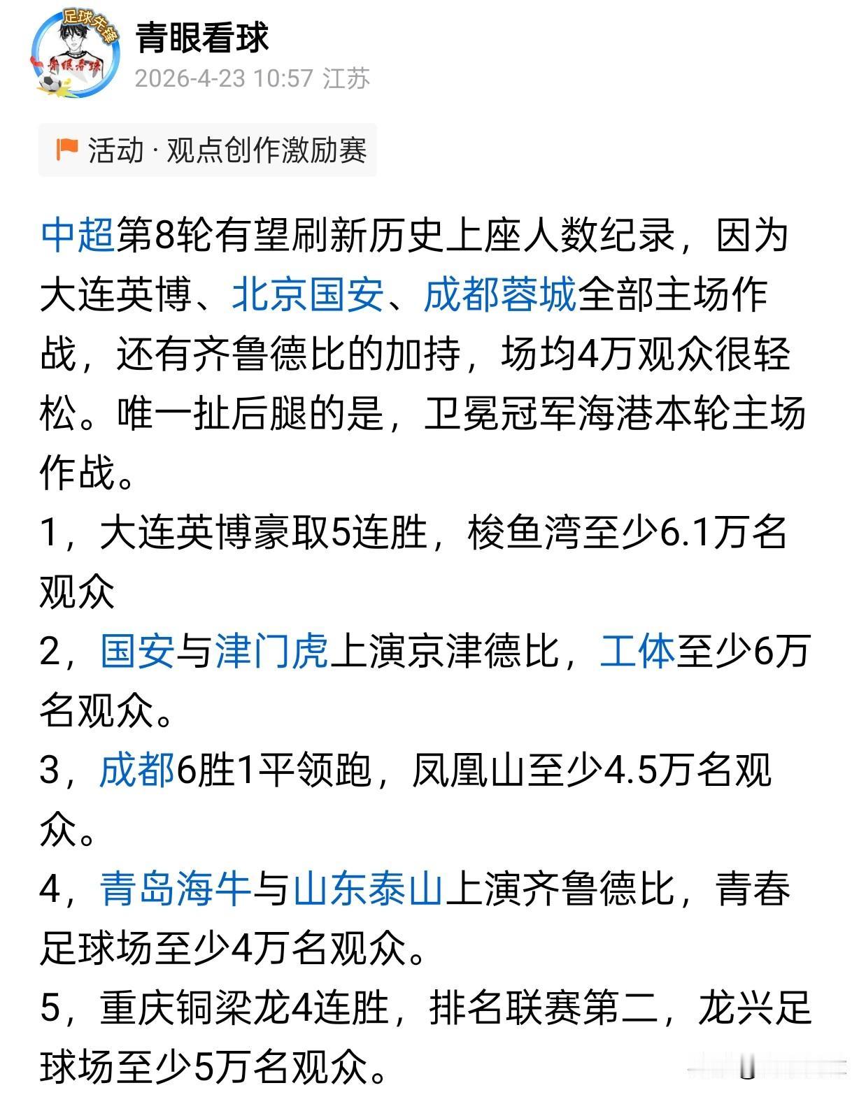 赛前我就预测,中超第8轮会刷新历史上座人数纪录。果不其然,本轮现场观众人数突破30万人,场均超过3.8万人。 1,梭鱼湾突破6.1万人,与我预测的一模一样。 2,工体5.5万人,我预测6万人。 3,龙兴5.5万人,我预测5万人 4,凤凰山4.1万人,我预测4.5万人。 5,青春3.7万人,我预测4万人。 我预测的误差,都在10%以内。