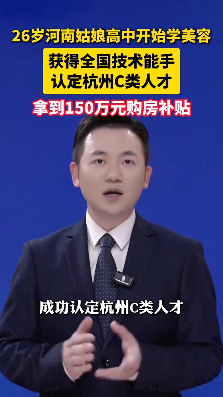 26岁河南姑娘高中开始学美容,获得全国技术能手,认定杭州C类人才,拿到150万元购房补贴。 主播浩嘉。 "杭行出状元"!26岁河南姑娘做美容师,成杭州C类人才,拿到150万元购房补贴。河南姑娘鲁家琦是一名美容师,高级技师。在初中升高中时,她选择了美容专业,开始学习技术。她参加技能大赛,还获得了全国技术能手。靠自己的努力,成功认定杭州C类人才,申请到了购房补贴,补贴有150万。 我通过自己的努力,还有杭州萧山的人才政策,让我能够去享受这一切。
