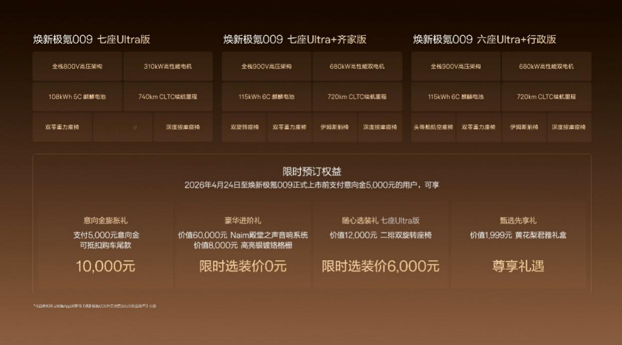 2026北京车展,极氪009带来改款车型并同步预售,共推出了七座 Ultra版、七座 Ultra+齐家版和六座 Ultra+行政版三个配置。 其中七座版Ultra+“齐家”是首次登场的全新版本。这个名字取自“修身齐家”,意在强调“高端多人口家庭出行”的定位。这也意味着极氪009开始关注家庭用户的出行需求了。 实际上在之前,极氪009最显眼的标签,就是成为丰田埃尔法这类明星MPV的替代者。数据上看,极氪009已连续两年获得中国40万元以上MPV年度销量冠军,并在2025年在香港地区销量超越埃尔法,斩获香港MPV销量冠军。 而现在,最新的改款车型除了更加注重乘客的乘坐体验,也更加关心车辆的行驶质感。 在座舱豪华体验方面,新车二排新增双零重力座椅,支持22个点位按摩及揉捏功能,四向自适应腰托。 七座版Ultra+配备二排双旋转座椅,搭配17英寸OLED吸顶屏,限时免费Naim殿堂之声音响系统。 性能方面,改款的极氪009四驱版采用全栈900V高压架构,零百加速3.9秒、极速220km/h。 115度电池匹配6C充电倍率,CLTC续航里程720公里。 同时,新车换装闭式双腔空气悬架与双阀CCD电磁减振器组合,标配千里浩瀚H7 G-ASD辅助驾驶系统,自带城市NCA以及自动泊车功能。 当然,这次升级,极氪009也并未推出任何混动版本,而是仍以纯电为主。 (原创/鹏宇)