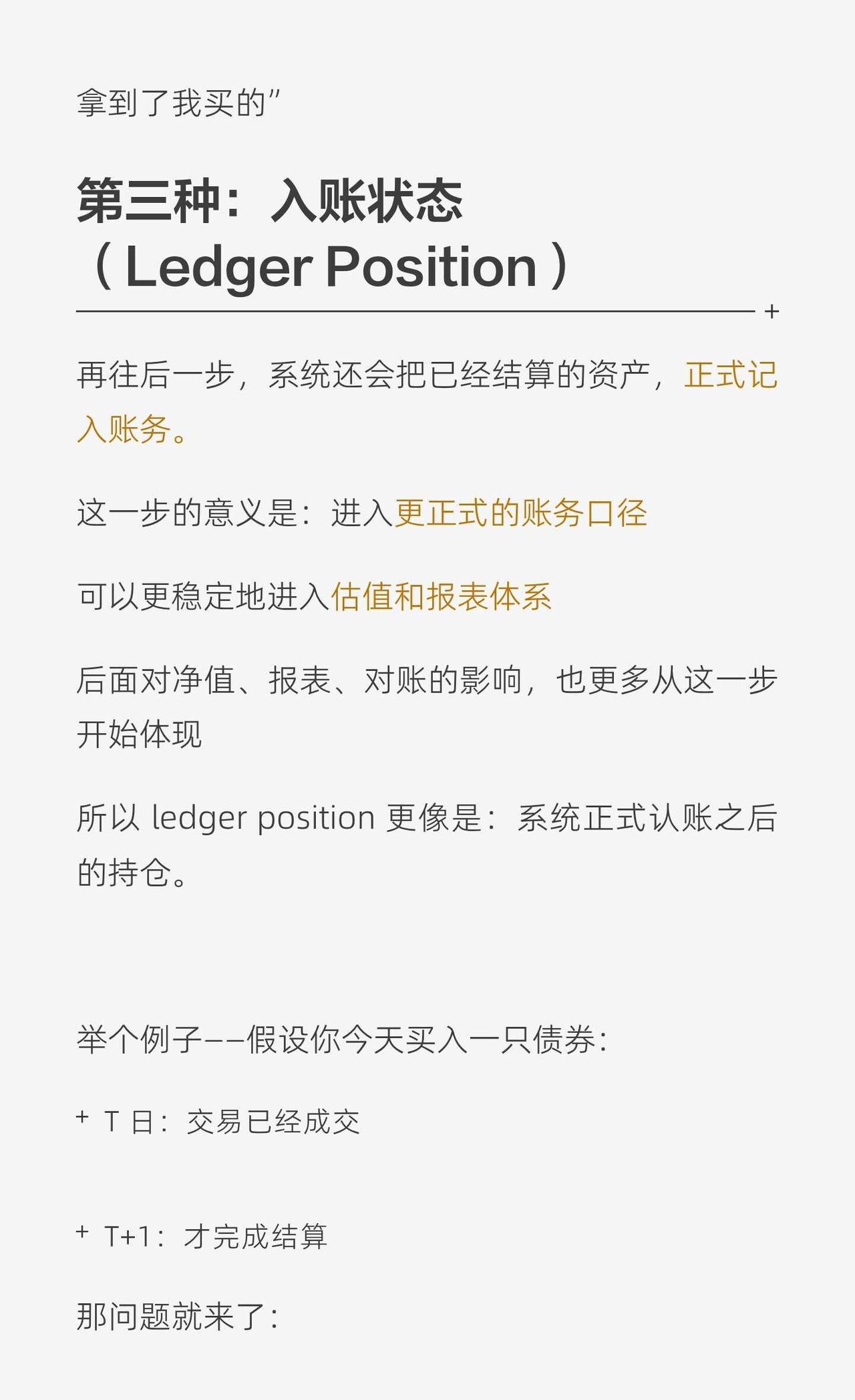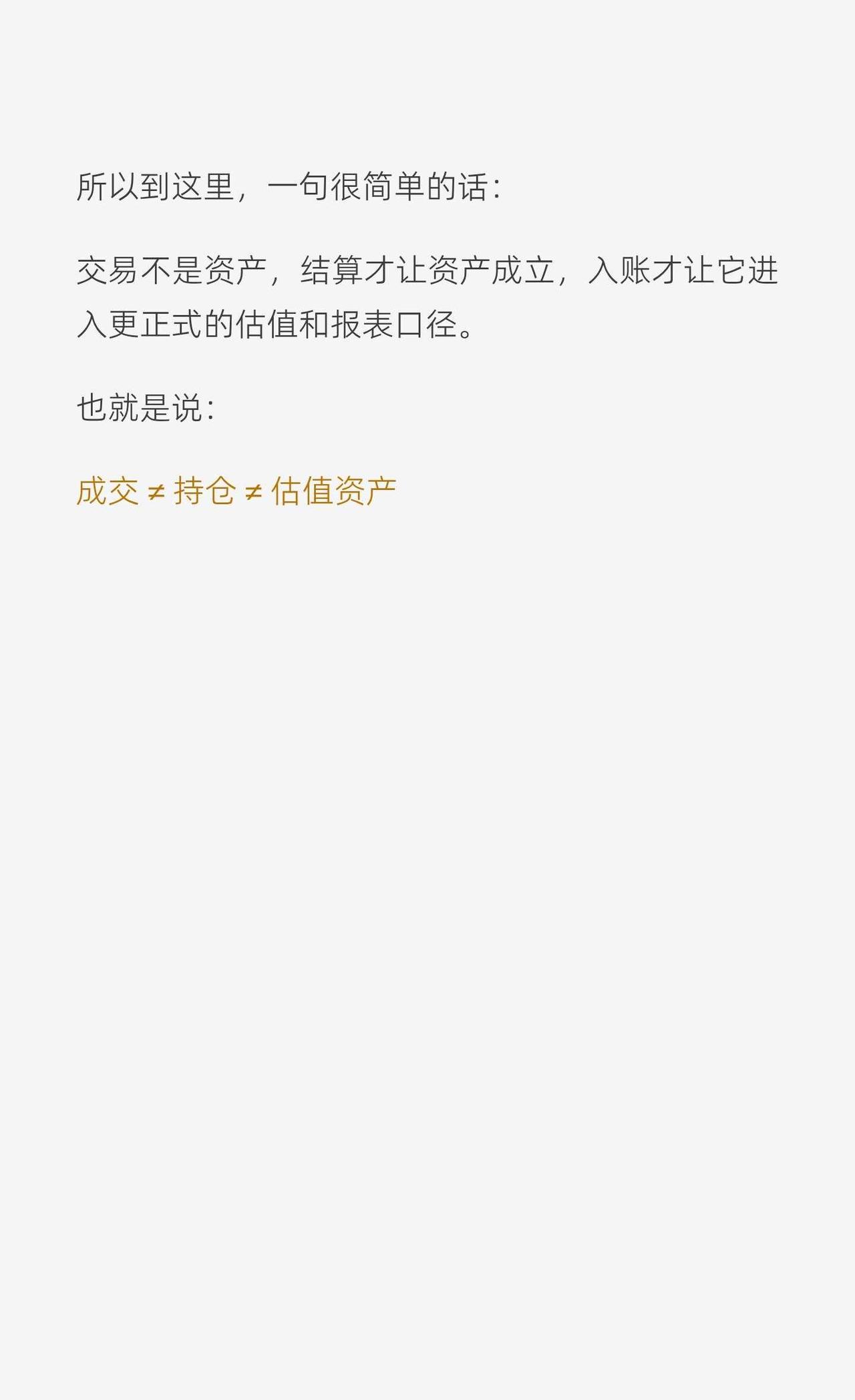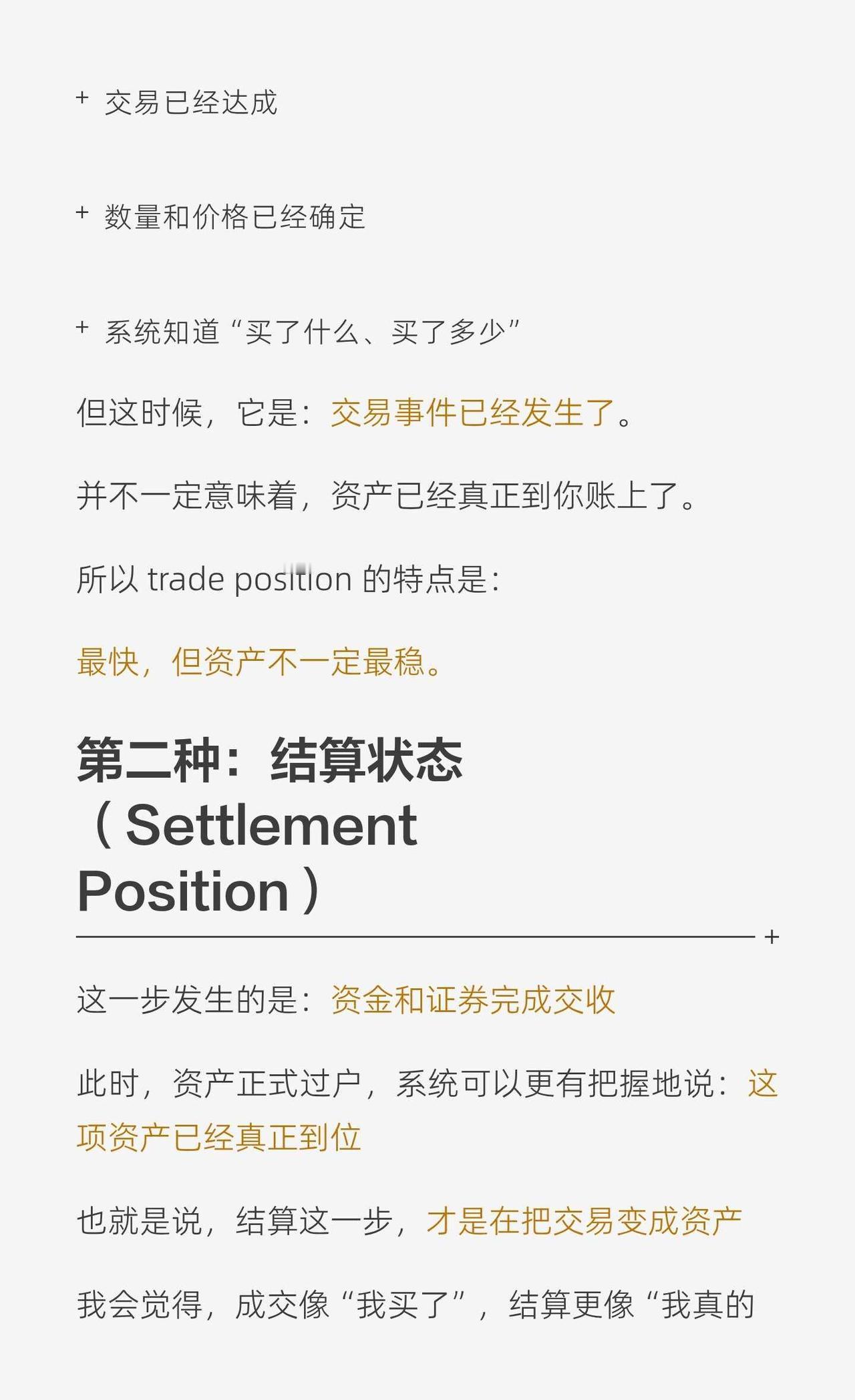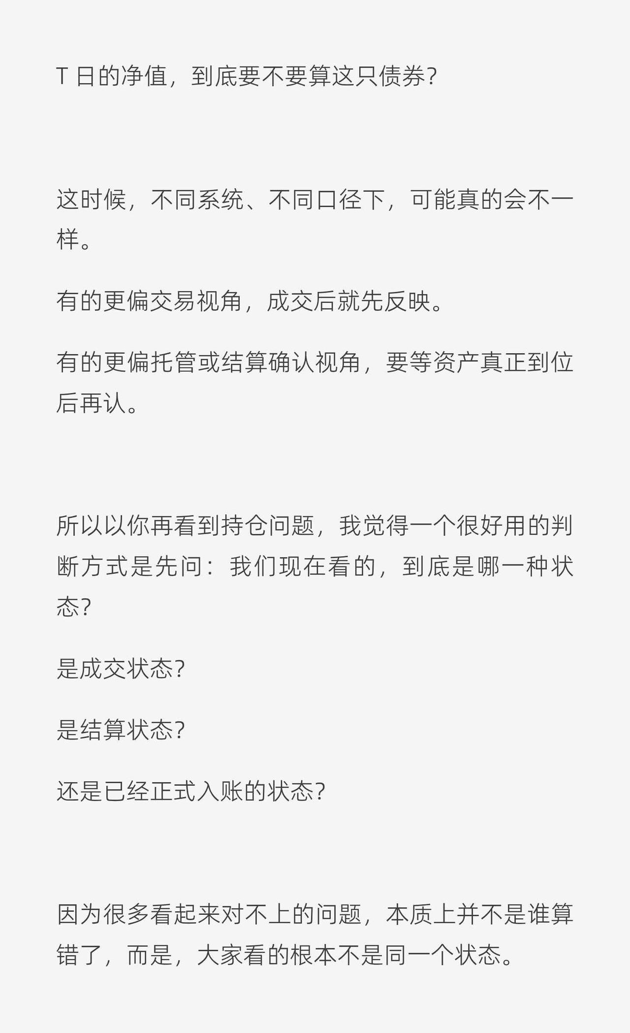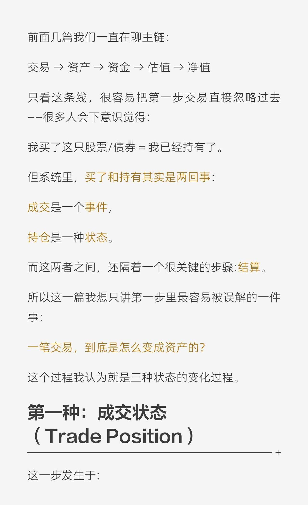 架构|成交不等于持仓 看到交易,我们会下意识觉得: 我买了这只股票/债券 = 我已经持有了 但系统里,这两件事其实不是一回事。 因为在系统视角里: 成交是一个事件, 持仓是一种状态。 它们之间还隔着一个关键步骤:结算。 所以一笔资产进入系统,通常会经历几个状态: 成交状态:交易已经发生,但资产未必真正到位 结算状态:资金和证券完成交收,资产正式成立 入账状态:系统正式记账,进入更稳定的估值和报表口径 这也是为什么很多持仓差异、NAV break,不一定是谁算错了,而是大家看的不是同一个状态。 成交 ≠ 持仓 ≠ 估值资产 关于持仓position,我之前写过一个更详细的分享贴 有兴趣也可以再去看看 托管业务 基金估值 结算 持仓