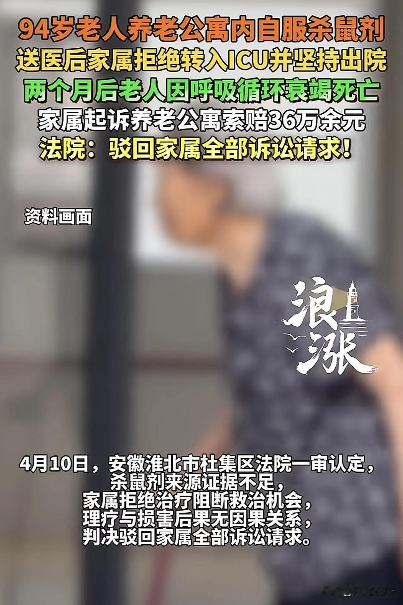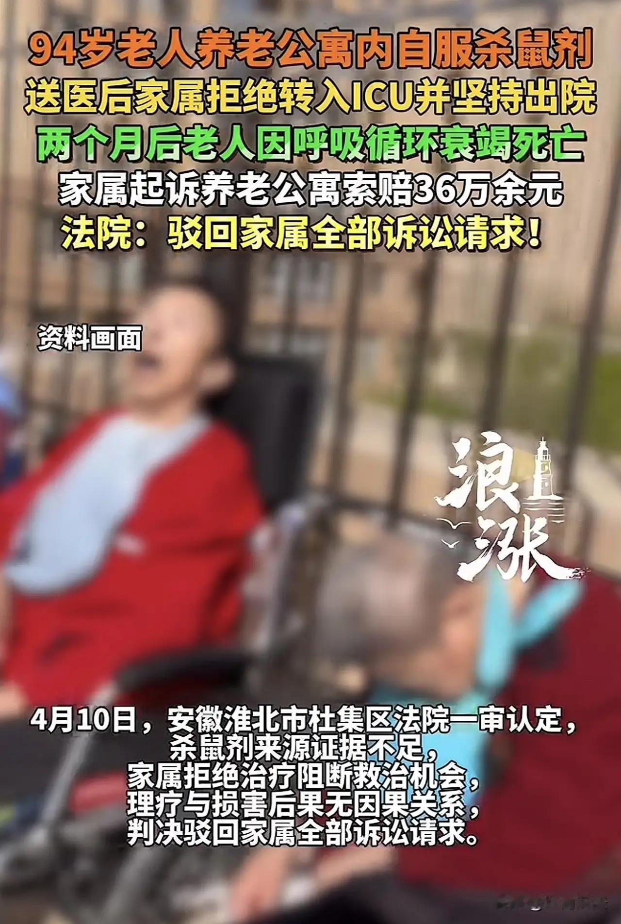 安徽icon,一94岁老人住养老院icon,因膝盖疼得受不了,竟吃老鼠药自杀,养老院立即将其送医,岂料,2个儿子却拒绝将老人送到ICU治疗和检查,而是坚持出院,老人不幸死亡,事后2个儿子却向养老院索赔36万,而法院判决亮了! 94岁老人养老院服毒身亡,儿子拒救反索赔36万,法院判决大快人心! 安徽淮北,一场令人心寒的悲剧引爆全网热议:94岁老人赵某入住养老院期间,因膝盖疼痛难忍,竟选择服用老鼠药自杀 。养老院发现后第一时间送医,可医院多次建议转入ICU抢救、做必要检查时,老人的两个儿子却坚决拒绝,执意办理出院。仅仅两个月后,老人便因呼吸循环衰竭不幸离世 。 让人愤怒的是,儿子们非但没有反思,反而反手将养老院和理疗师告上法庭,索赔36.2万元!他们声称理疗师操作不当弄破老人血管,还指责养老院未尽安全保障义务,一口咬定老人自杀与机构脱不了干系。 可法律从不会纵容无理取闹!2026年4月10日,淮北市杜集区法院一审判决字字铿锵:驳回家属全部诉讼请求,养老院与理疗师均无责。 法院给出的三大理由,堪称教科书式的责任界定: 第一,无证据证明老鼠药来源于养老院。家属无法证实老人服用的毒药与机构管理有关,不能推定养老院存在管理失职; 第二,家属主动放弃救治,阻断生机。医院已明确告知老人病危、强烈建议ICU抢救,可儿子们执意出院,这一行为直接阻断了最后的救治机会,后果必须由家属自行承担 ; 第三,理疗与损害无因果关系。没有任何医学鉴定或证据能证明,理疗行为与老人血管破裂、最终死亡存在直接关联。 消息一出,全网炸锅!网友们纷纷怒评:“放弃抢救时狠心,索要赔偿时贪心,这哪里是子女,分明是算计!”“94岁老人疼到服毒,背后是无人真正心疼的晚年绝望”。 这起案件戳破了很多人的误区:把老人送进养老院,从来不是“甩手掌柜”,更不是将所有责任推给机构。养老院的安全保障义务有明确边界,它不是万能保险箱,而子女的监护、陪伴与救治责任,永远无法推卸。 赡养父母,是生养之恩的回馈,不是算计利益的筹码。这纸判决,不仅驳回了无理索赔,更给所有子女敲响警钟:养老尽孝,容不得半点敷衍与算计,别让晚年的父母,在绝望中独自凋零! 你如何看待这起案件?欢迎在评论区吐槽发声!湖北老人自杀 苏州生病老人 硕士喝药自杀