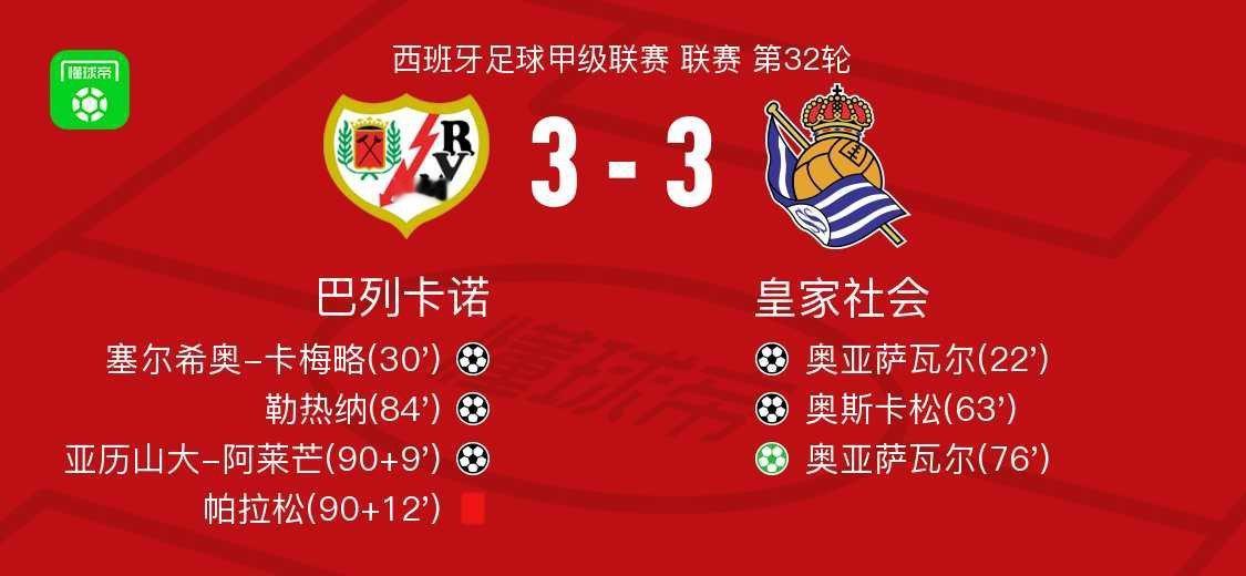 北京时间4月26日西班牙足球甲级联赛 联赛 第32轮,巴列卡诺主场对阵皇家社会。巴列卡诺塞尔希奥-卡梅略破门,勒热纳破门,亚历山大-阿莱芒破门。皇家社会奥亚萨瓦尔梅开二度,奥斯卡松破门。最终比分巴列卡诺 3-3 皇家社会。足球