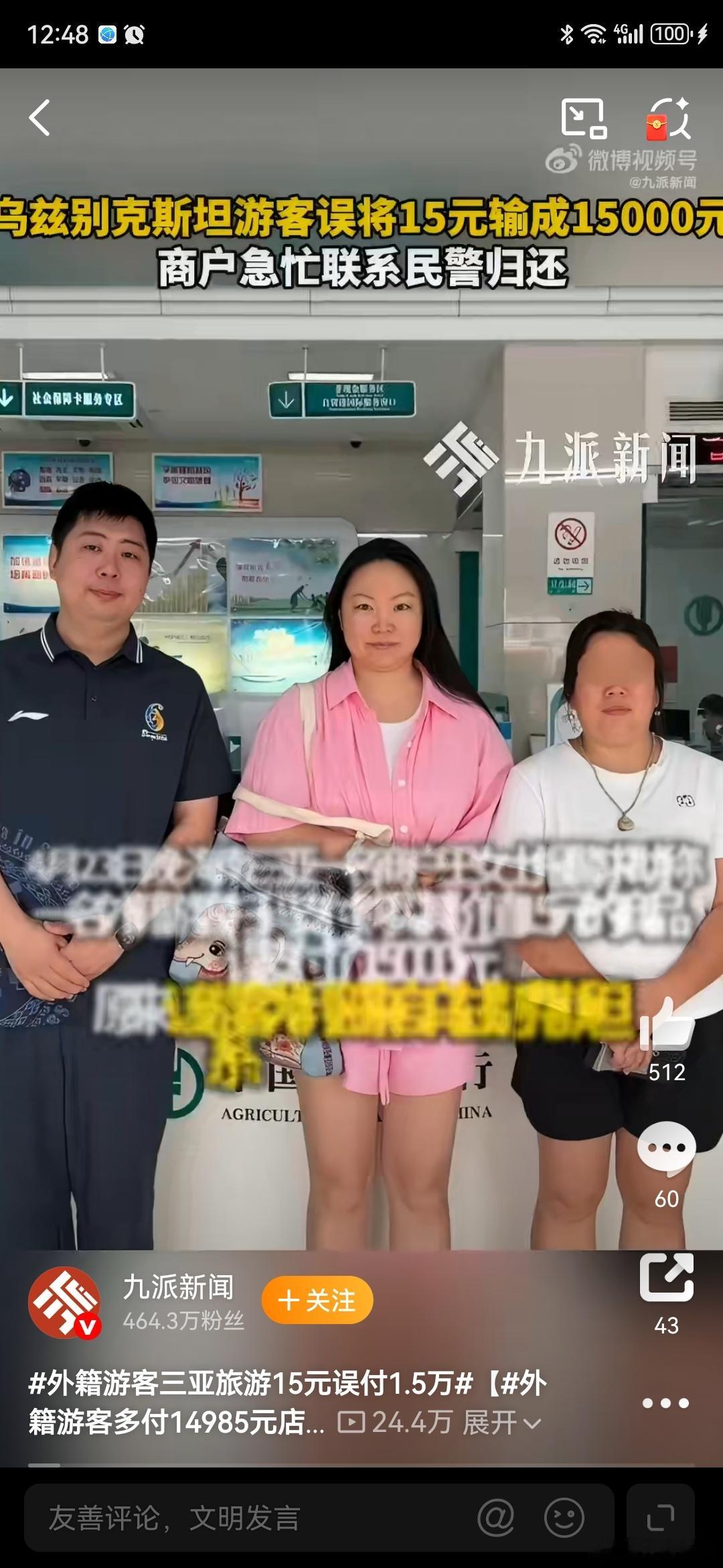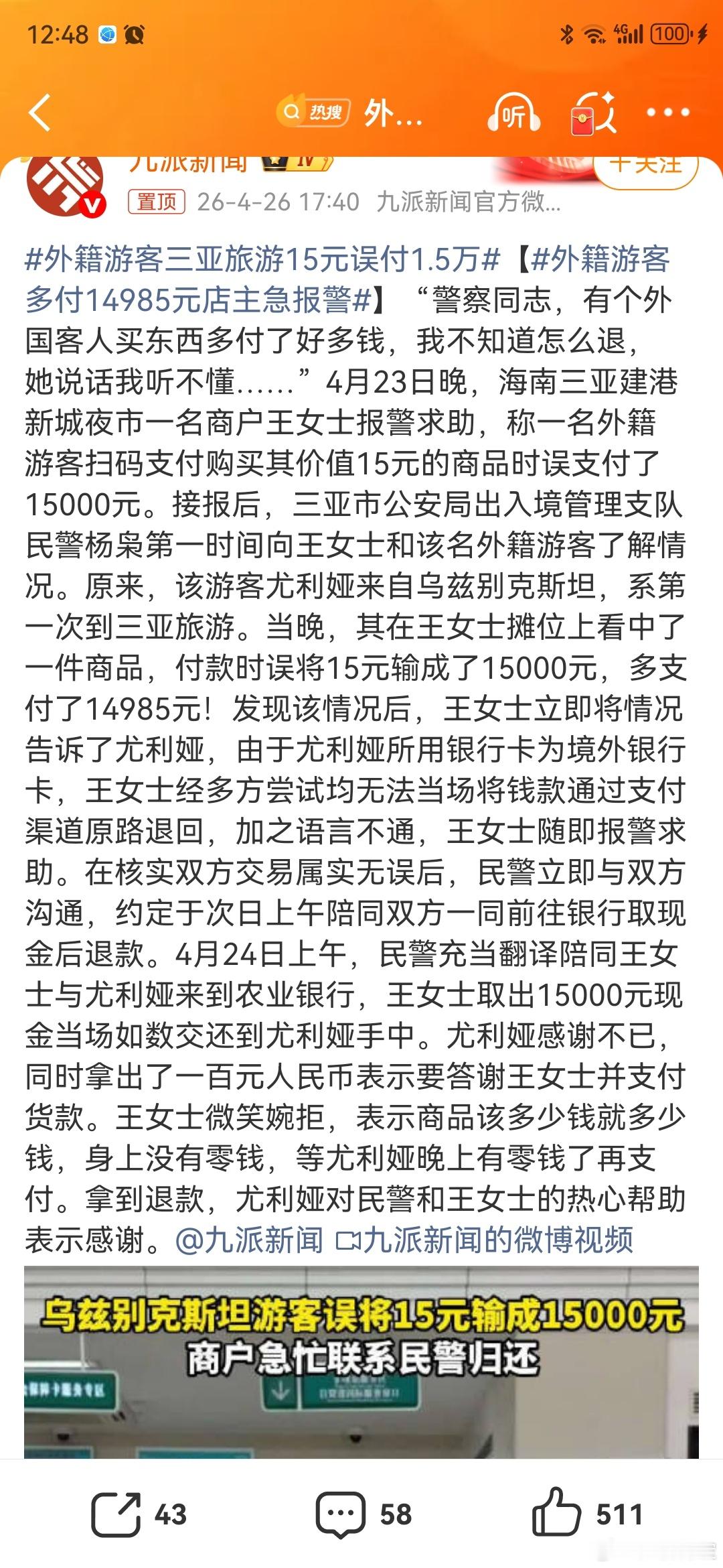 外籍游客三亚旅游15元误付1.5万