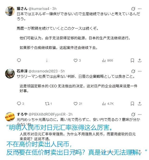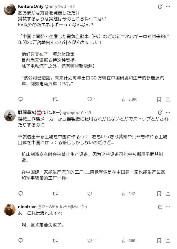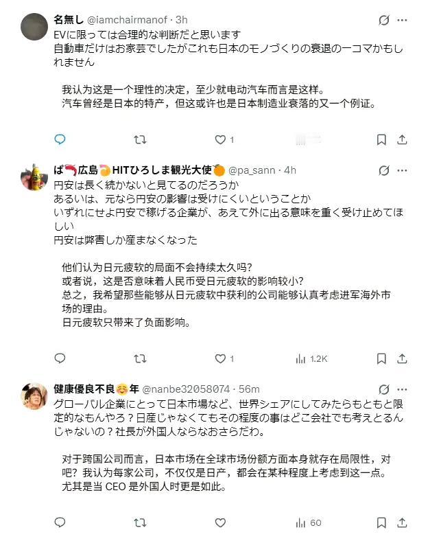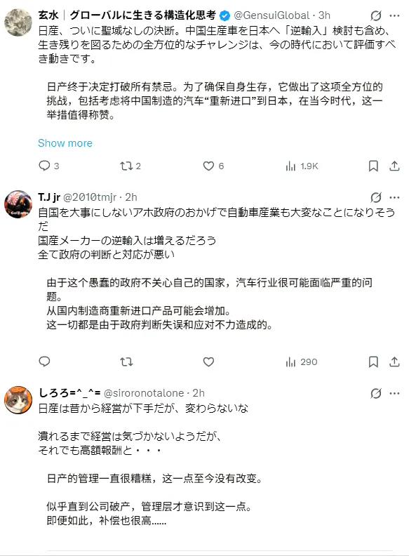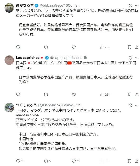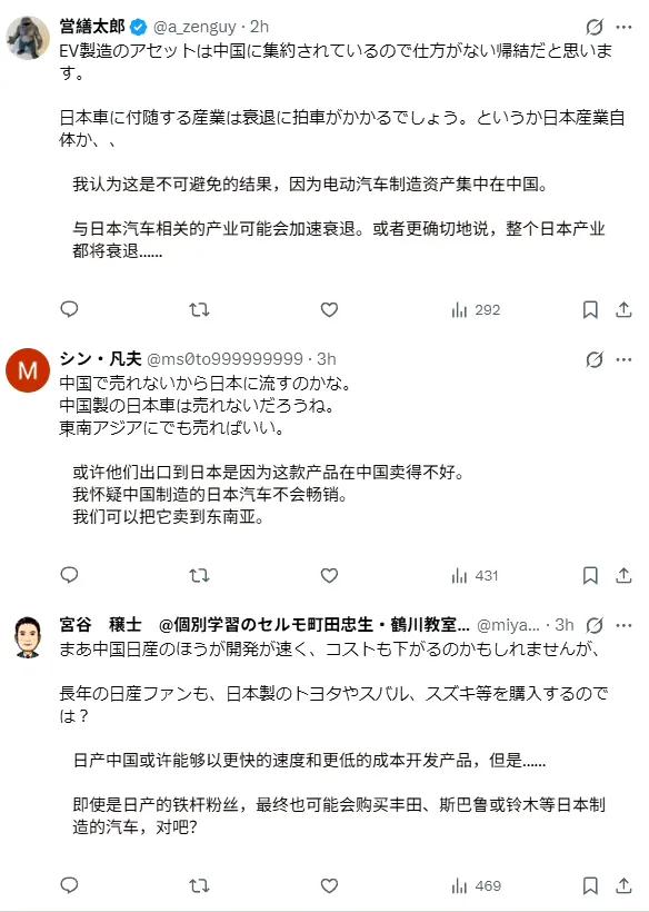 日产公司决定在中国制造电动汽车,然后再返销到日本。 日产选择在华生产电动车再筹划返销日本,本质是看清了现实差距。如今我国新能源产业链成熟完整,成本可控、技术迭代快,配套供应链优势碾压日本本土。反观日本电车发展滞后,产能、性价比全无优势。 日产依托中国造车体系,既能压缩生产成本,又能借助成熟技术补齐自身电车短板。一边利用中国制造降本增效,一边把成品运回本土销售,既省钱又能填补日本市场电车缺口。不得不说,日系车企也放下身段,承认了我国新能源产业的硬实力,这也是行业发展的必然趋势。 但是,日本网民并不这么看。他们冲到这个新闻下面,冲着日产公司发脾气。来看看他们都是如何破防的。 “我每天都会经过公司总部的直廊,明明他们已经关闭了工厂,居然还计划在日本销售产品,真是太不可思议了。” “愚蠢的公司不断做出愚蠢的选择,并越陷越深。” “即使是日产的铁杆粉丝,最终也可能会购买丰田、斯巴鲁或铃木等日本制造的汽车。” “日本人将为电动汽车战略的失败付出代价。日产和丰田真是把事情搞砸了。” 日本家电的昨天,也许就是日本汽车的明天。