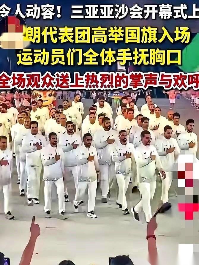 在三亚亚沙会开幕式的转播回放里,有一段短短几秒的入场镜头,被无数人反复拖拽进度条。 在一片热火朝天的入场通道里,这支队伍给出的反应,实在太安静了。 他们没有大幅度挥舞手臂,也没有对着镜头蹦跳狂欢。 几十个人的方阵里,每一张被场馆强光照亮的脸上都带着长途跋涉的疲态,但在走近主看台的那一刻,所有人不约而同地将右手五指并拢,严丝合缝地压在左胸前,随着脚步的放缓,上半身顺势前倾,完成了一个毫无声响、却极度厚重的抚胸礼。 他们是伊朗代表团。 为了能准时踩上这条入场通道,这群人刚刚熬过了一场堪比“渡劫”的赶路。 在当下各种复杂的阻碍下,直飞成了奢望。航班辗转、绕路、候机,全队生生在路上耗了五十多趟小时。而此时此刻,他们背后的家乡,也正陷在外界无数的坎坷与风波里。 按照常理,顶着这么大的压力、吃了这么多苦头才站到聚光灯下,就算情绪失控想要发泄,或者故意卖惨博取同情,都再正常不过。 但他们把这些东西,全都咽了下去。 右手贴心,在他们的老规矩里,意思是“把真心捧出来”。 带着一身疲惫,顶着外界的重重乌云,这群人在东道主的地盘上,硬是绷住了一口最纯粹的气,把最郑重的尊重,交给了眼前的赛场。 哪怕门外风雨飘摇,推门做客时,依然会拍干净鞋底的泥土,理平衣褶,安静地低头致意。 底牌再烂,姿态不乱,这大概就是一个民族最硬气的体面。