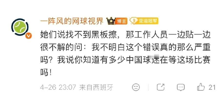 马德里公开赛官方工作人员整出来的“乌龙事件”:媒体间工作人员在莱巴金娜vs郑钦文这场比赛还未开打前,就把莱巴金娜的名字写进了下一轮胜者的空格里面,让很多人以为郑钦文退赛了…… 而工作人员的解释也是非常牵强:说找不到黑板擦。后来选择了用胶布贴住莱巴的名字,还轻描淡写的说“我不明白这个错误真的那么严重吗”…… 不得不说,马德里公开赛官方也是一个草台班子,尽整这些幺蛾子!!!