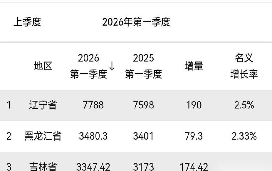2026年一季度的东三省经济账本刚翻开,底牌就全亮出来了。 辽宁依然坐稳了“老大哥”的位置,7788亿的总量摆在那,像一块压舱石。但2.8%的增速,让这块石头的移动速度显得有些迟缓。虽然增量拿到了190亿,可名义增速只有2.5%,这每一步都走得不轻松。 最让人意外的是吉林。 虽然吉林的总量在三省里排在最后,只有3347.42亿,但它跑得最快。4.5%的实际增速,就像一个在赛道上拼命加速的短跑选手。更具体的表现是名义增速,直接顶到了5.5%,这让吉林硬生生啃下了174.42亿的增量,差一点就追上了体量是它两倍多的辽宁。 黑龙江的处境则显得有些尴尬。 账本上写着3480.3亿的总产值,增速3.7%,看起来比辽宁还快一点。可转头看一眼增量,79.3亿这个数字在表格里显得格外瘦弱,连吉林的一半都没到。 三份成绩单放在一起,虽然各家都在使劲,但不得不面对一个现实:谁都没能跑赢全国的平均线。 辽宁在守家,吉林在冲刺,黑龙江还在找感觉。这块老工业基地的复兴,看来不只是数字跳动那么简单,每一步都是在跟过去的自己死磕。 有人看好吉林的这股冲劲,觉得这是转型的苗头;也有人替黑龙江捏把汗,担心这增量跟不上节奏。你觉得,东三省想重回巅峰,光靠“快”能解决问题吗?