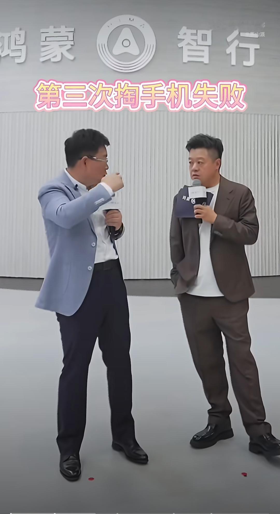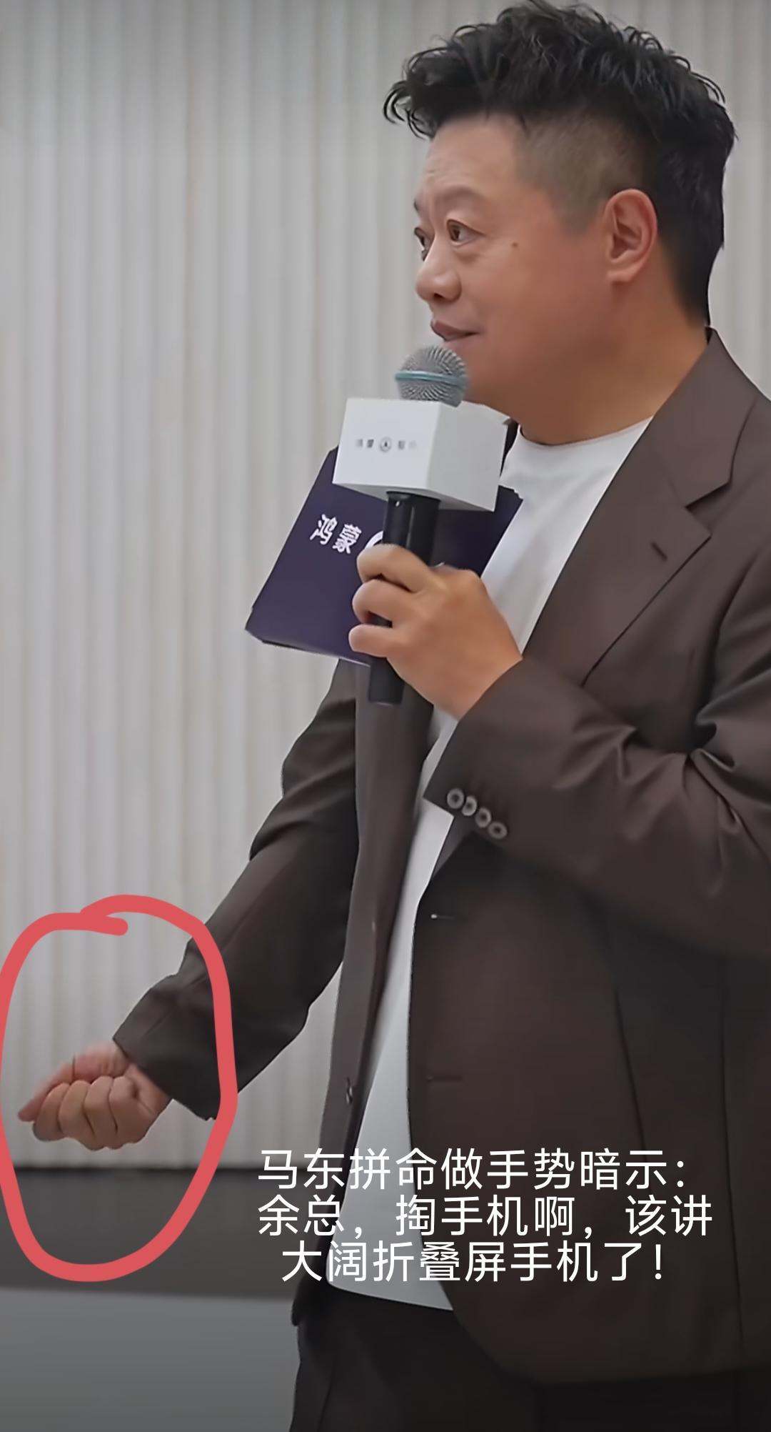 我敢说,北京车展上鸿蒙智行会客厅的直播肯定没有彩排过,因为,余承东居然在直播时“掉链子”了,把主持人马东急得不行。 直播快结束的时候,马东想要让余承东介绍一下华为大阔折叠屏PuraXMax手机,结果,暗示了半天,讲车讲嗨了的余总愣是不配合,马东从口袋里掏了四次手机才掏成。 看到这一段时,我差点笑喷了。 当时已经是快到中午十二点,五个界的展位都已经介绍完,直播接近尾声了,按照直播流程,还有一个介绍大阔折叠屏手机的环节,可是余承东讲车讲得正投入,忘了手机这茬了。对着直播镜头和现场人山人海的观众,马东作为主持人又不好明说,便打算掏出自己口袋里的大阔折叠手机,好让余承东看到后及时把话题引回手机上。可是,马东每掏一次手机,余承东都没有注意到,照样继续聊车的话题,马东往自己口袋里连掏了三次手机,三次都被余总打断没有掏成功。看着继续滔滔不绝继续聊车的余总,马东急得不行,一个劲的做手势喑示。直到第四次,马东才终于掏出手机并成功让余承东讲回手机的内容。余承东说,昨天(4月25日)华为PuraXMax开售第一天就卖爆了。 看来,马东从鸿蒙智行赚点主持费真不容易啊!华为 余承东 鸿蒙智行