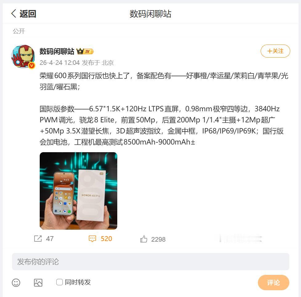 刚刚看到数码圈内大佬,分享了关于荣耀600系列国际版的硬件配置,大佬表示国行将会有备案配色方案,例如好事橙、幸运星、茉莉白、青苹果、光羽蓝、曜石黑,据说国行还会将电池增加到8500mAh-9000mAh±,确实令人期待的配置改变