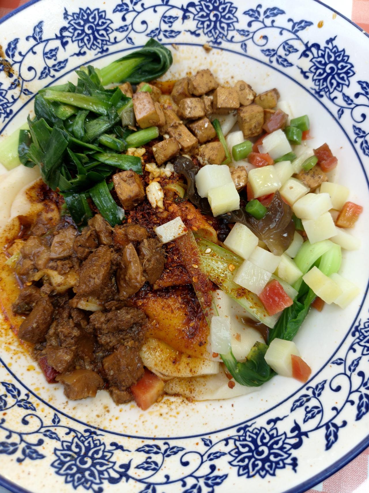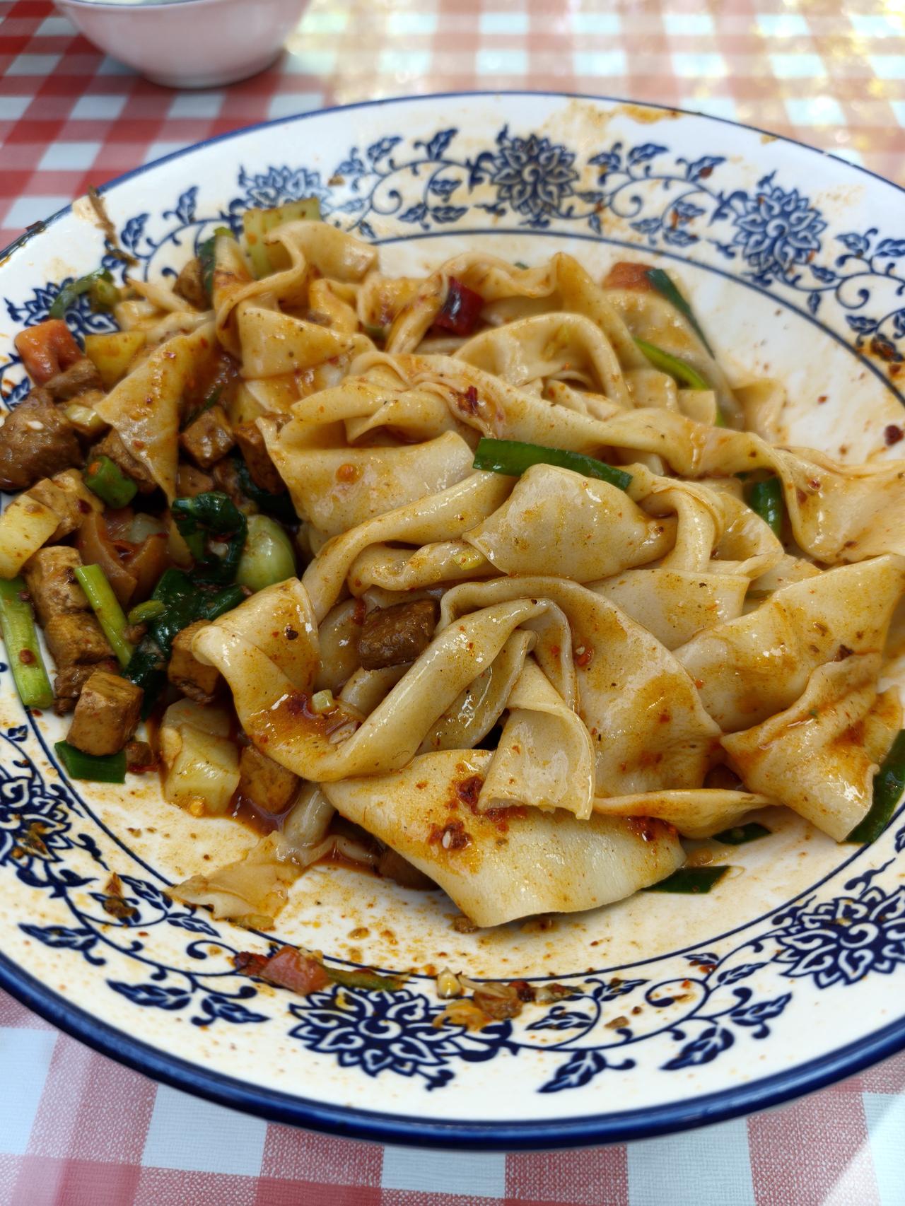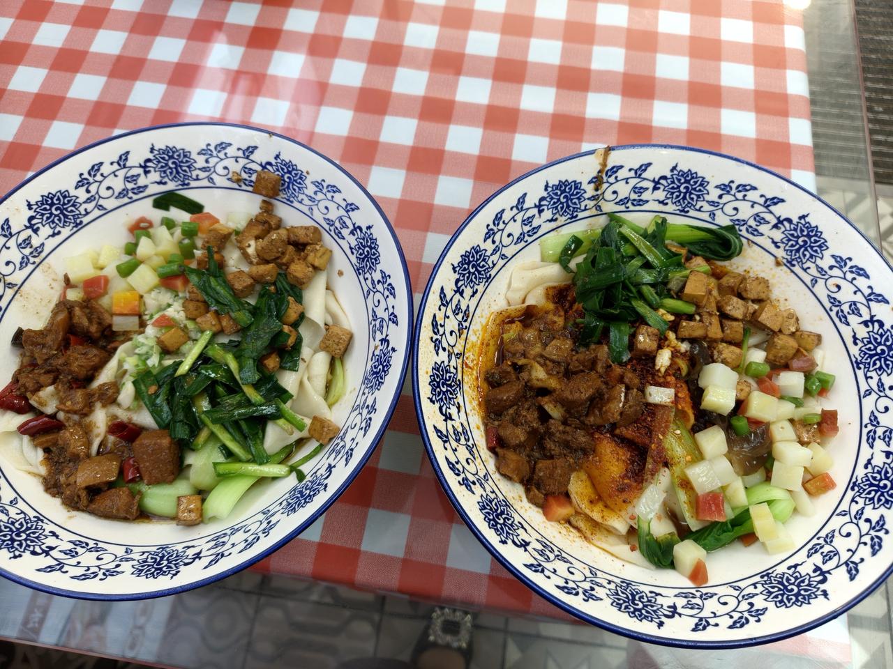 不知道为什么网上总是有人说西安的面分量少,这是昨天在电子二路一个小面馆里吃的户县软面,纯粹的手擀面,又宽又薄软软的,加上肉臊子和各种菜,味道很香。 一碗面端上来看着不是很多,但是面量真的大,吃到最后也没吃完,就这还能免费加面,不知道为什么总有人说来西安吃的面,量又少又贵,那种只有一碗底的面我是一次都没有碰到过,不知道游客都是在哪里吃到的。