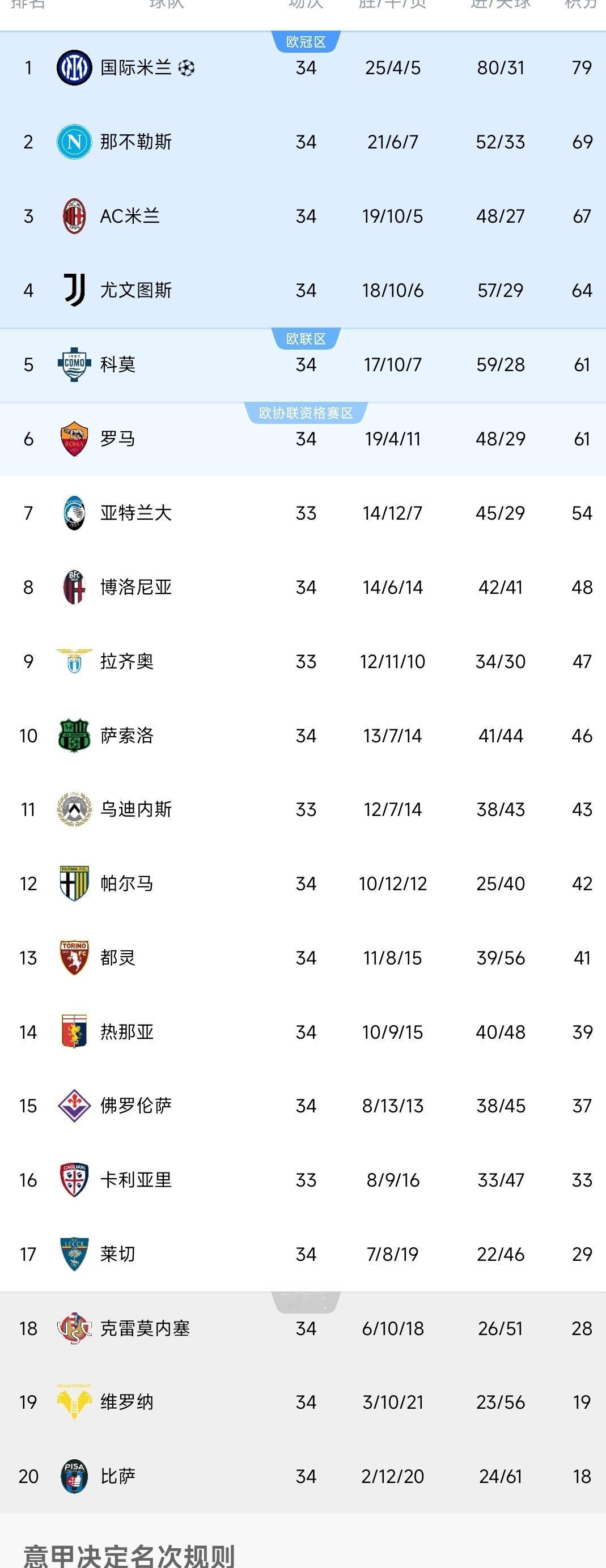 意甲一夜排名更新! 国米2-2,下轮取胜=夺冠! 米兰0-0尤文,仍居第三! 北京时间4月27日,意甲联赛第34轮角逐。 ①都灵2-2国米。 国米前程进展是比较顺利,组织进攻,第23分钟迪马尔科精准起高球连线图拉姆高高跃起头球“暴扣”得手(1-0),随后稳扎稳打是基本掌控节奏,直到第61分钟通过角球传中找到比塞克抢点破门(2-0)扩大优势,本来看起来胜利近在眼前,却不曾想这只是开始。 落后的都灵没有放弃,第70分钟中场直塞打穿防线策动反击,西蒙尼插上禁区低射入网,这让他们是看到希望,乘势追赶是再有收获,第79分钟造成奥古斯托禁区手球犯规,弗拉西奇点球命中,从0-2到2-2,短短十分钟扭转颓势,最终两队握手言和。 ②AC米兰0-0尤文图斯。 两支队伍踢得较为谨慎,没有过多冒险的选择,等待对手犯错,因此制造的威胁屈指可数。比赛第38分钟图拉姆门前铲射得手,但越位被吹无效,尤文空欢喜一场,持续缠斗,半场依然交白卷。接下来的时间相似节奏,各自调兵遣将,米兰主场0-0战平,各自得到1分。