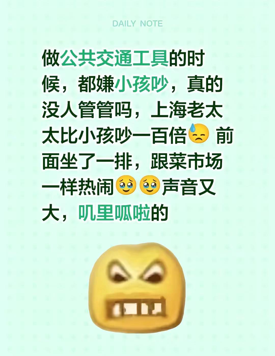 做公共交通工具的时候,都嫌小孩吵,真的没人管管吗,上海老太太比小孩吵一百倍😓 前面坐了一排,跟菜市场一样热闹🥹🥹声音又大,叽里呱啦的