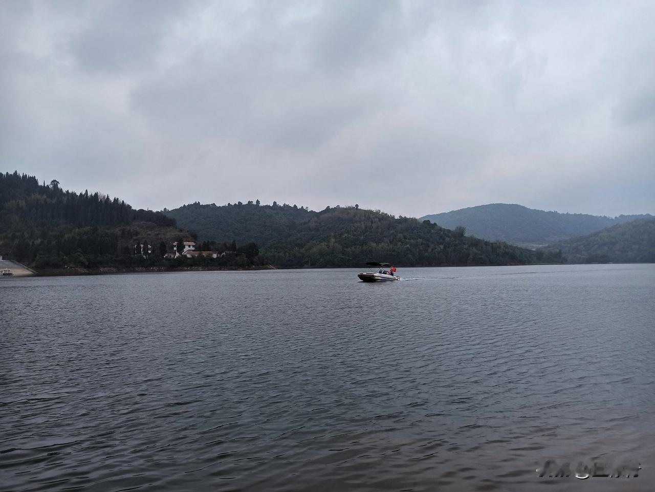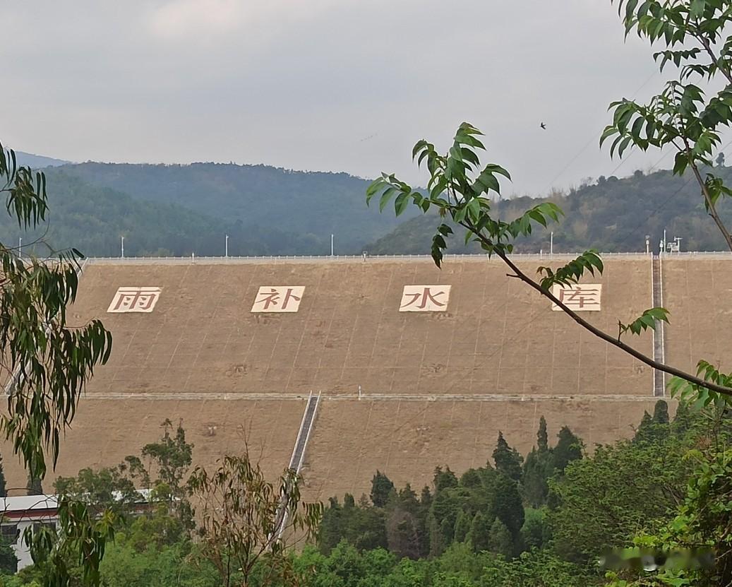 弥勒雨补水库三面环山,一条大坝横卧山间,湖水清洌,平滑如镜。对岸有温泉数座,掩映