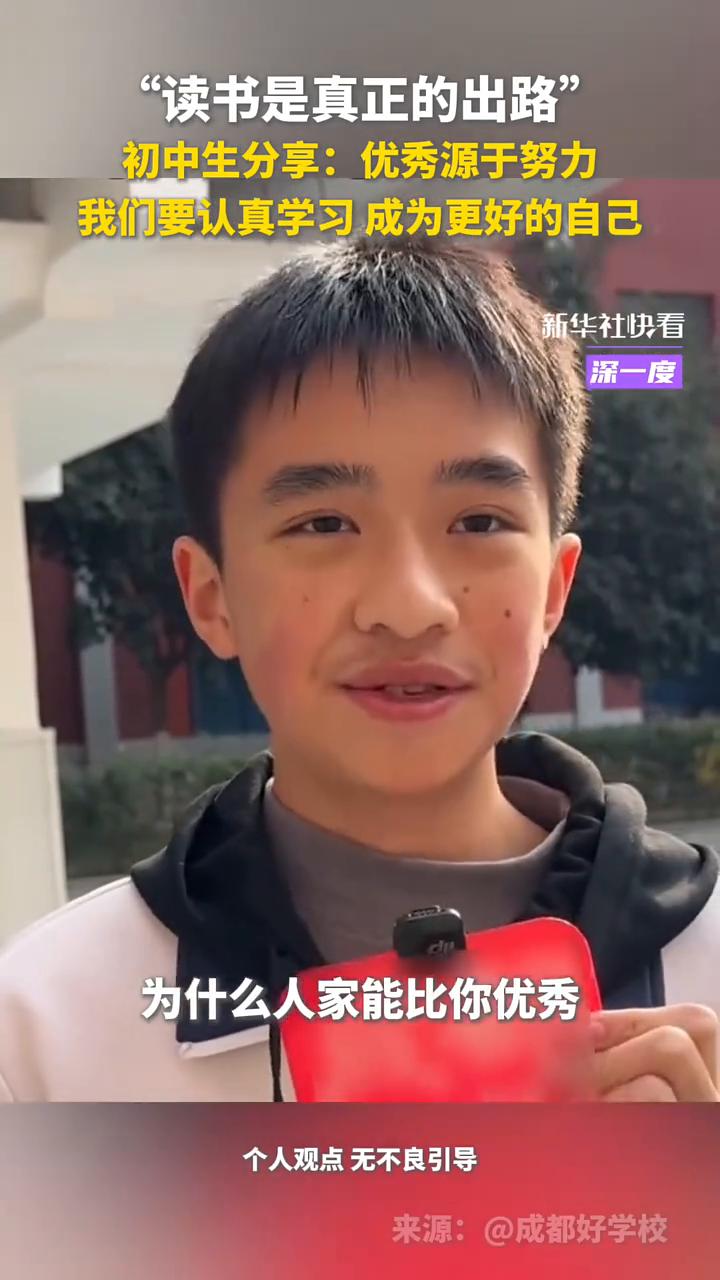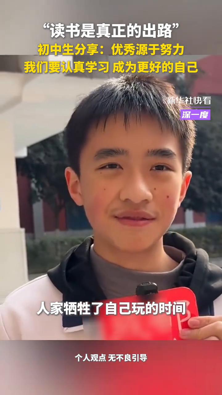 初中生分享:优秀源于努力,我们要认真学习成为更好的自己。 新华社快看。 读书是真正的出路,为什么人家能比你优秀?人家比你努力了,人家牺牲了自己玩的时间,你何不考虑一下?不要从人家身上找问题,你要考虑一下自己身上有什么?我是不是哪里比他差?我是不是应该向他学习?该吃吃,该喝喝,该玩玩,该学习的时候就认真学习,不要荒废了自己的学业。 现在是该奋斗的时候,我们要做的就是成为更好的自己,然后有自己的兴趣,有一技之长。