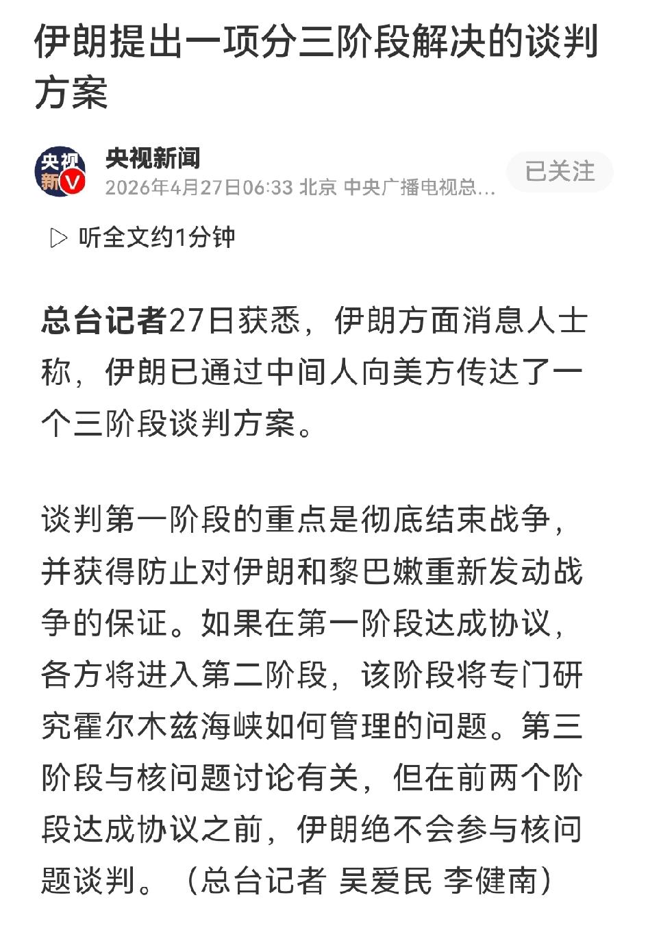 伊朗通过中间人给美国递三阶段谈判方案,先停火再谈海峡最后核问题。 伊朗这方案划得明明白白:第一阶段必须彻底结束战争,还得拿到美方保证不再打伊朗和黎巴嫩;第二阶段才谈霍尔木兹海峡怎么管;第三阶段核问题,前两步谈不成免提。 这算盘打得华盛顿都听见了。以前美方总把核问题当敲门砖,现在伊朗直接把顺序倒过来,先解决身家性命,再谈家门口的海峡,最后才轮到核议题。这就像买东西,先看质量保不保证,再谈怎么送货,最后才说价格,少一步都免谈。 美方估计头大。以往谈了好几轮,总卡在海峡管控和核问题上,现在伊朗又加了停火和安全保证的硬门槛。想绕开第一阶段直奔核问题?门儿都没有。伊朗这是把战场主动权悄悄搬到谈判桌,你不先给我安全感,我凭啥跟你谈核心利益? 有意思的是,这方案刚好戳中美国痛点——既想稳住中东,又不想放弃对伊朗的军事威慑。就看美方是愿放下身段按规矩来,还是继续耍横搞双重标准了。