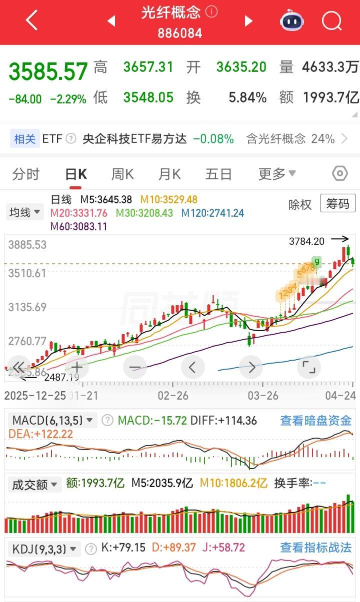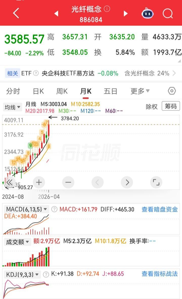 板块已经翻了三倍,龙头股涨幅10倍!都涨了两年了才告诉我?是何居心? 光纤概念利好来了,光纤行业景气度攀升,主流产品订单已经排到了2027年初。我去看了一下光纤概念,其实算是一个比较新的概念,2024年8出现,月线级别呈现单边上涨。从905.27点涨到了现在的3585.57点,本月呈现加速上涨,涨幅达到19.79%,收出了月线级别的最大阳线。一般加速上涨都是为了赶顶,所以 ,这个位置必然是风险大于收益。所以我是肯定不会关注! 现在慧眼来做个小调整,大家说光纤概念还能涨吗?认为还会上涨的扣1,认为要下跌了的扣2。都说主力能够预判散户的预判,然后反向收割散户,咱们验证一下是不是真的!