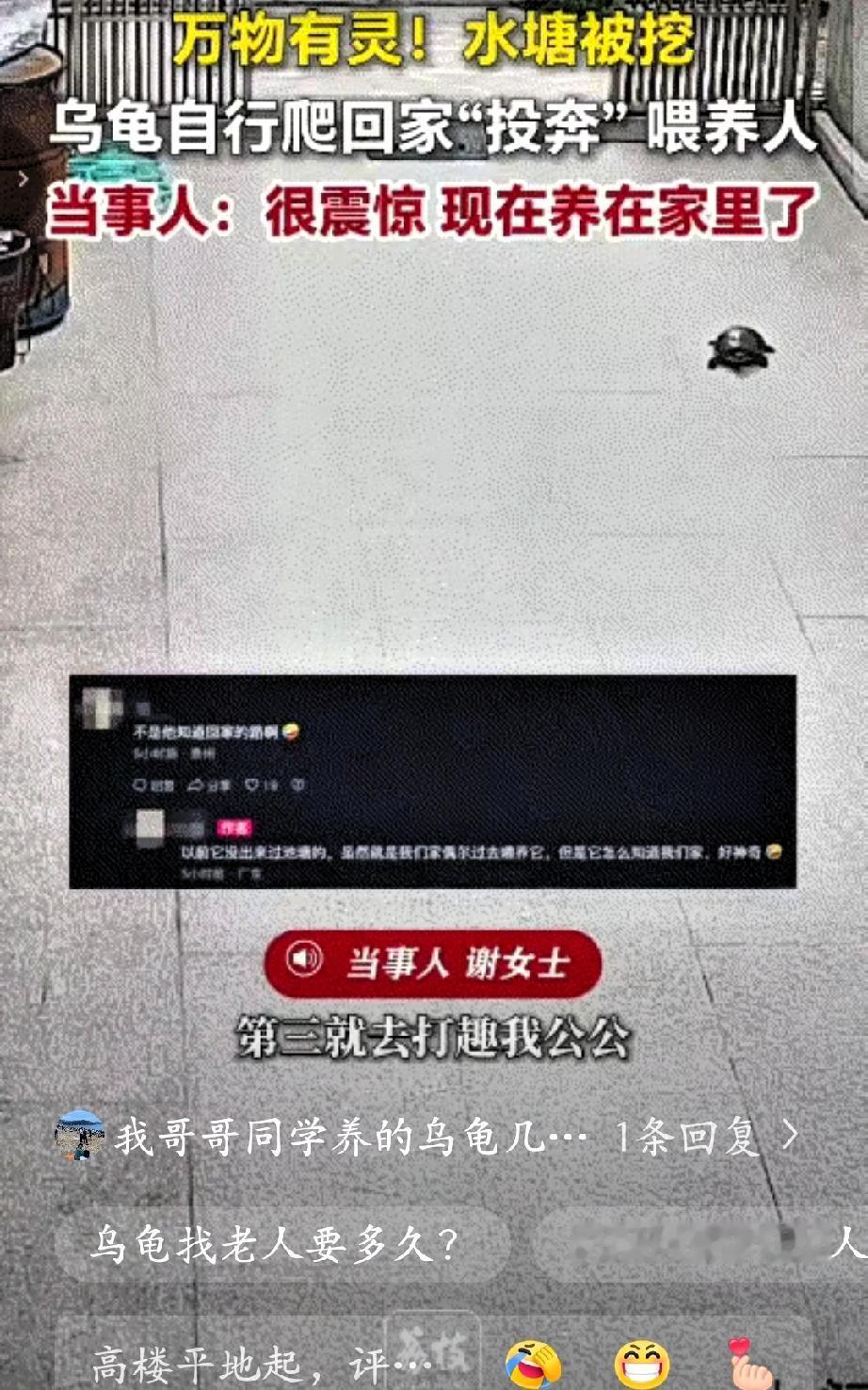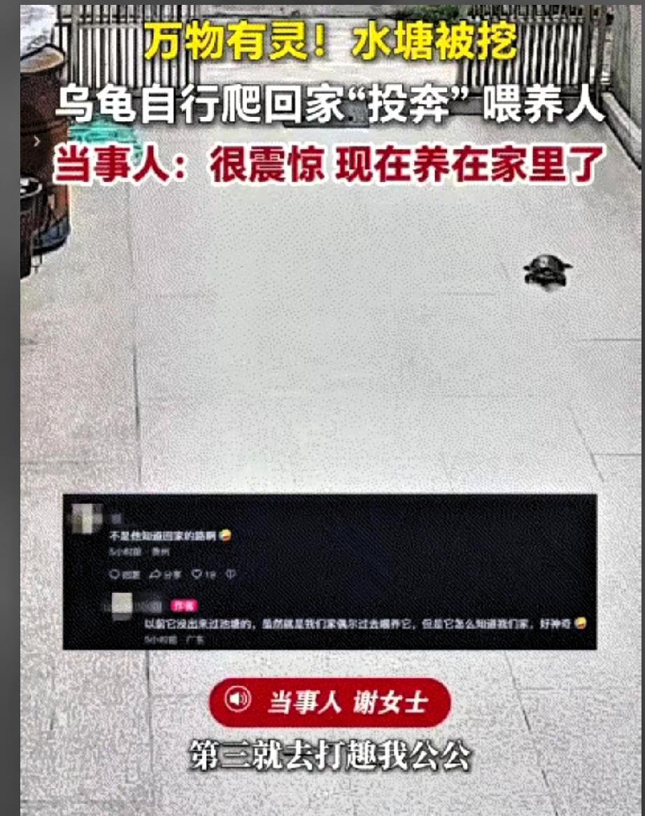 科学都解释不清了。 近日,广东汕头一只野生乌龟从废弃废墟中爬出,它从未踏足过人类家门,却一路目标坚定,精准爬到常年投喂它的老人家门口。 这只草龟原本生活在村里闲置水塘,老人每日散步路过,都会投喂饲料。时间久了,乌龟见到老人便会主动游到岸边等候,一人一龟慢慢有了默契,形成了稳定的相处习惯。 后来水塘改造被填平,乌龟的栖息环境彻底消失,老人也一直担心它的去向,怕它无处生存。令人意外的是,这只乌龟从废墟中艰难爬出,开启了漫长的爬行旅程。 它全程没有进入过人类住宅,却方向明确,精准朝着老人家里前进。一路上,它爬过碎石区域,小心穿过马路,途中还会停下来观察来往车辆,规避危险,最终稳稳爬到老人家门口。 监控记录下整个过程,网友纷纷感慨生命的灵性。我们总觉得乌龟行动缓慢、认知有限,却忽略了它们也能记住善意、感知温暖。 老人日复一日的投喂,只是日常里一件小事,却被小乌龟长久记挂,跨越距离奔赴而来。没有刻意的表演,没有多余的目的,只是出于本能的信任与回馈。 这件事也提醒我们,善意不分大小,真诚的付出总能被感知。生活里很多不起眼的温柔,看似平常,却能成为另一个生命的依靠。万物有灵,真诚相待,总能收获温暖的回响。你觉得生活里还有哪些不起眼的善意,悄悄温暖过身边的生命?