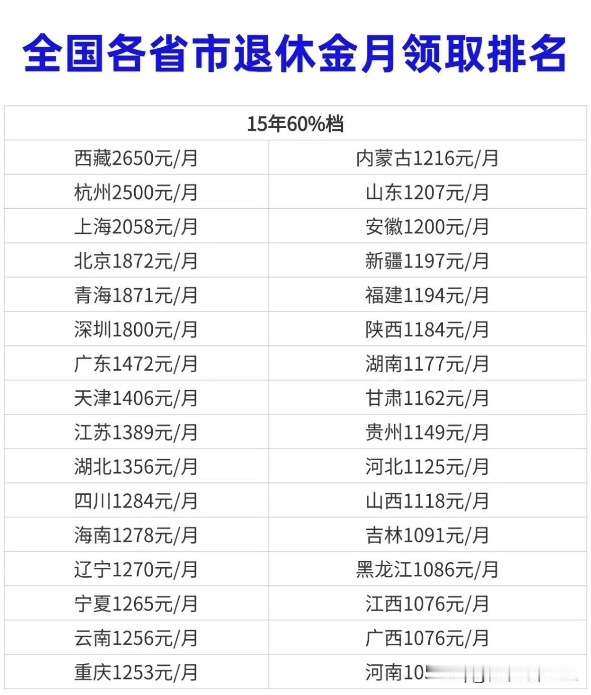 全国退休金月领排名出炉!看看你家乡排第几☞☞☞ 全国各省市15年60%档的退休金数据来了,看完真有点出乎意料 西藏以2650元/月稳居榜首,这数字比不少地方都高出一截,属实让人羡慕;杭州紧随其后2500元,难怪都说江南养老舒服,这退休金够实在; 再看大城市,上海2058元,北京1872元,深圳1800元,虽说绝对值不低,但生活成本摆在那,也算中上游水平; 让人意外的是青海,1871元的退休金,和北京几乎持平,看来西北省份的养老保障挺给力; 广东1472元、天津1406元、江苏1389元,这些经济大省的退休金也算稳中有进; 再往下看,山东1207元、安徽1200元、四川1284元,基本在1200元左右徘徊,过日子得精打细算; 黑龙江1086元、江西1076元、河南1054元,这些省份的退休金相对偏低,老人们得多加留意开支规划。 其实退休金多少是一方面,当地物价、生活节奏也很关键。你家乡的退休金在哪个水平?评论区聊聊~ 退休金排名