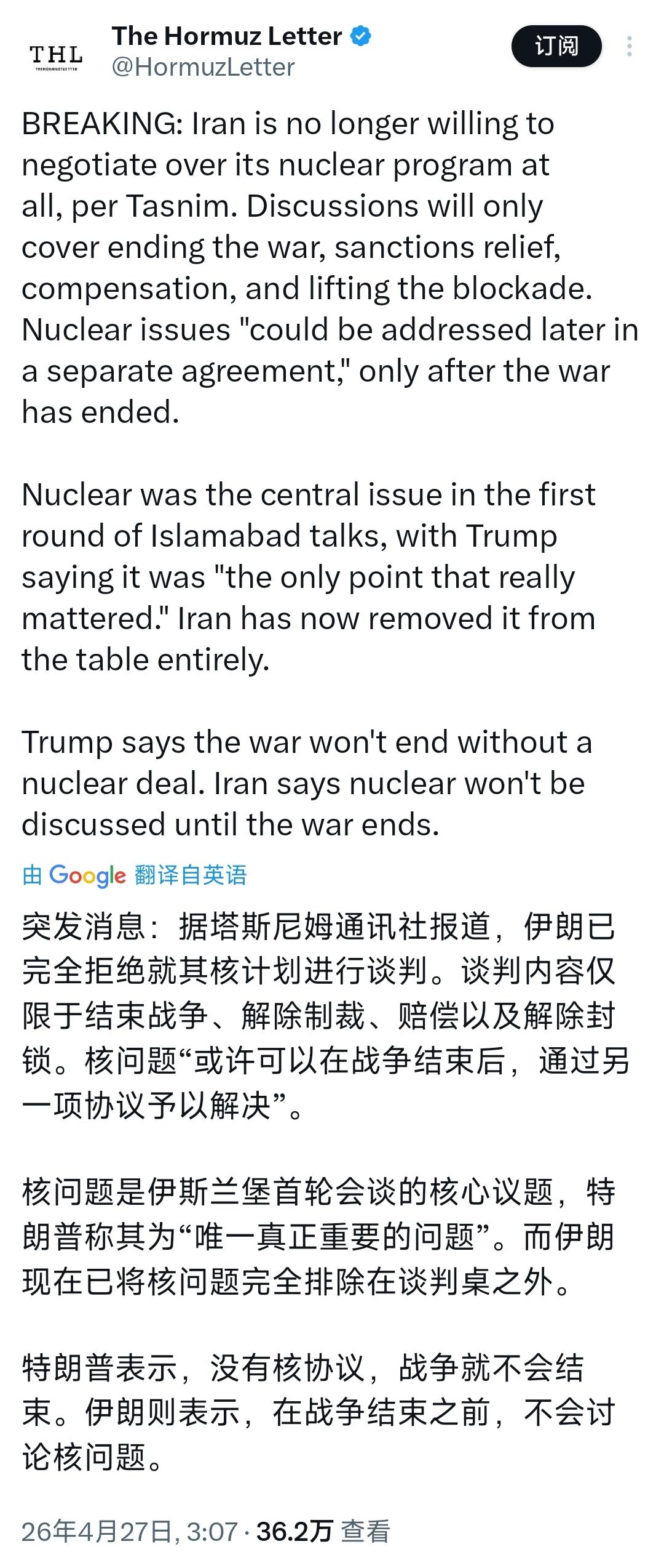 突发消息:据塔斯尼姆通讯社报道,伊朗已完全拒绝就其核计划进行谈判。谈判内容仅限于结束战争,解除制裁,赔偿以及解除封锁。核问题“或许可以在战争结束后,通过另一项协议予以解决”。 核问题是伊斯兰堡首轮会谈的核心议题,特朗普称其为“唯一真正重要的问题”。而伊朗现在已将核问题完全排除在谈判桌之外。 特朗普表示,没有核协议,战争就不会结束。伊朗则表示,在战争结束之前,不会讨论核问题。 [机智]评几句:这已经演变成一场典型的“胆小鬼博弈”,双方在“先停战”还是“先弃核”的死结上彻底僵住,看谁先眨眼。伊朗咬死“战争不结束,核问题免谈”,将核筹码完全剥离谈判桌,实质是把球踢回给美国:想让我自废武功,得先解除制裁和封锁,并支付赔偿。而特朗普则坚持“没有核协议,战争不结束”,试图以军事高压逼伊朗就范。目前局面是双输的消耗战:伊朗在封锁下面临经济窒息,美国则深陷中东泥潭。短期内谁先让步取决于谁更扛不住内爆——是伊朗的民生崩溃倒逼妥协,还是美国的中期选举压力迫使降低要价。这场僵局大概率以“分阶段、有条件”的模糊协议收场,而非某一方的彻底投降。