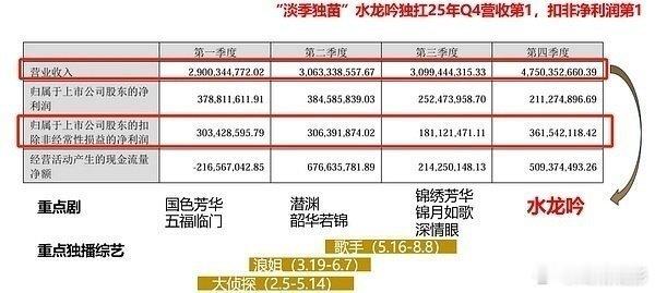 罗云熙水龙吟很优秀,Q4营收第一。水龙吟衍生收入及全球ip价值王者,作为“淡季独苗”助力芒果营收47.5亿,近五年最高。该剧ip授权周边销售断层领先,助力小芒电商实现首次年度盈利,招商额高达5.6亿元,广告单价从30秒180万飙升至260万,吸引10余家品牌追加合作。全球化发行标杆,覆盖全球近200个国家和地区,创国产剧出海发行新纪录!
