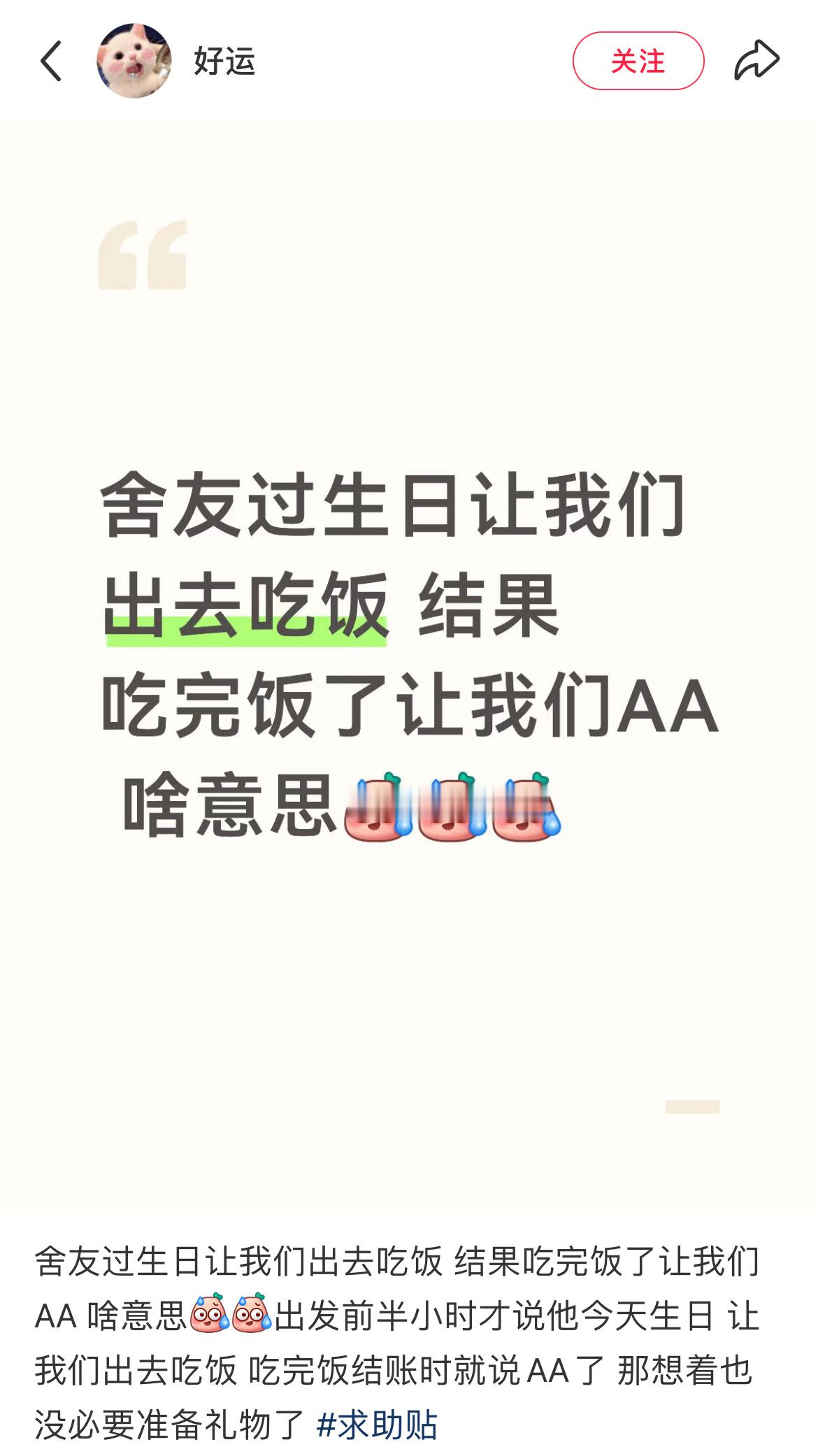 舍友过生日让我们出去吃饭AA