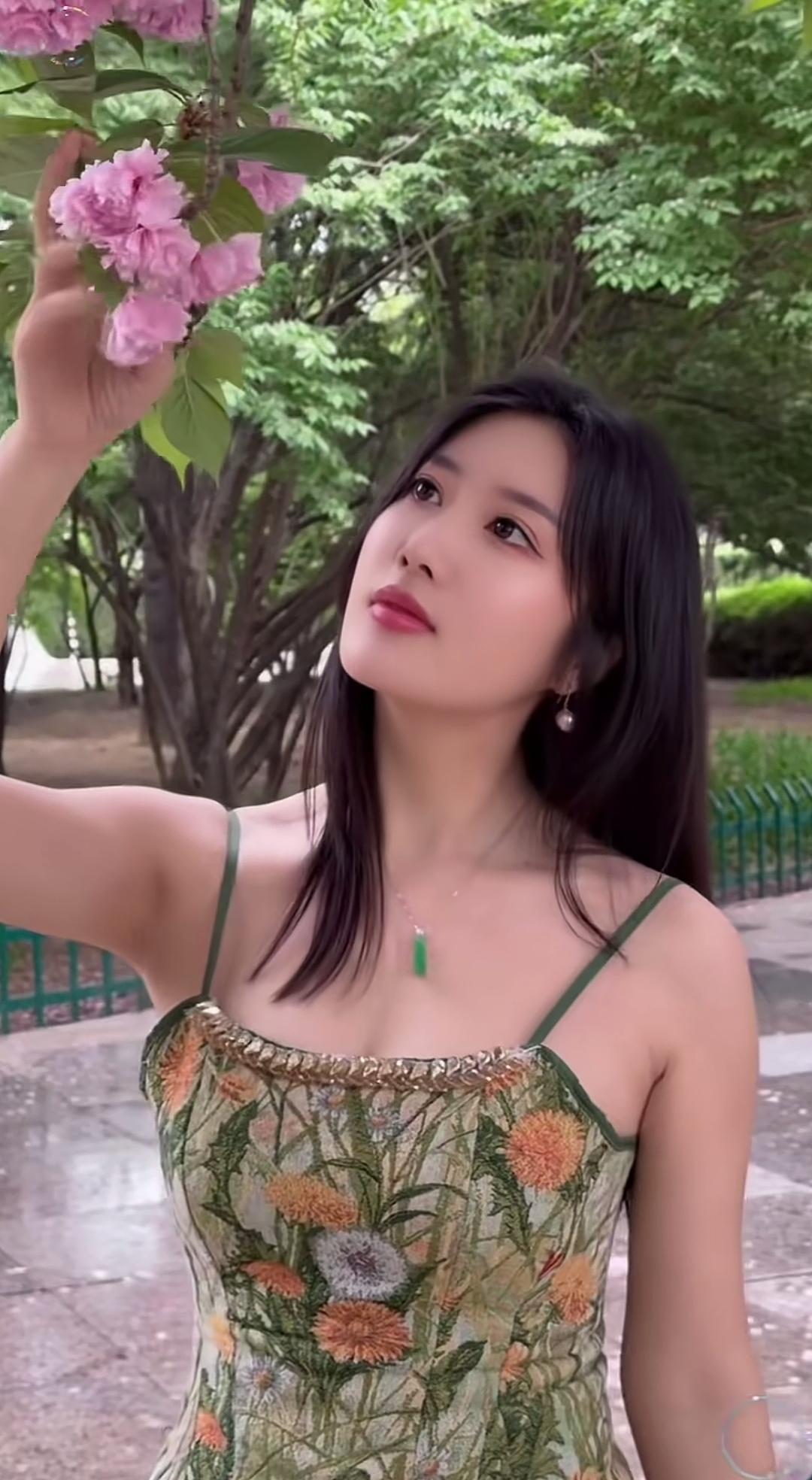 她正在公园里闻花香呢。