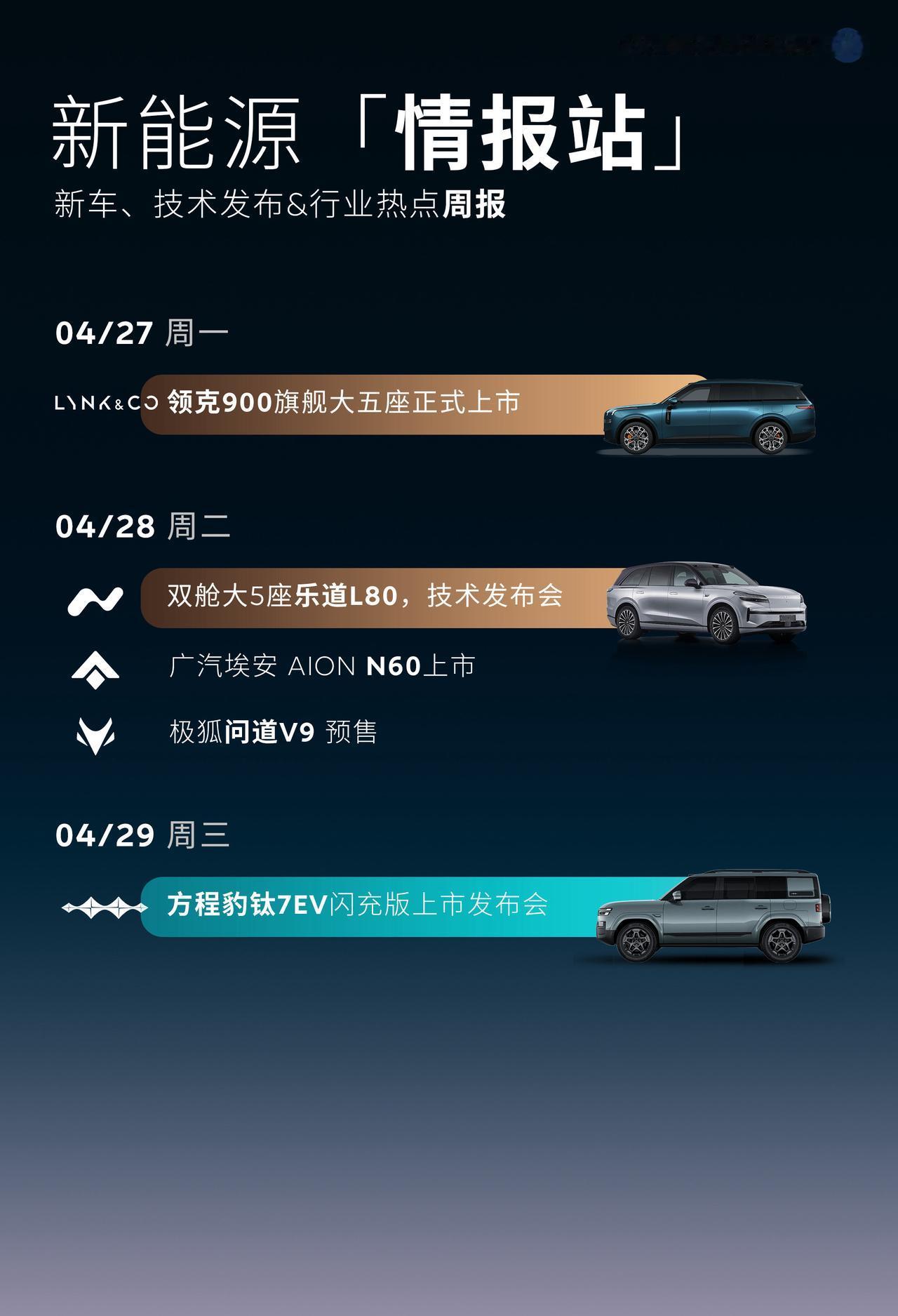 相比上周北京车展密集新车发布完, 再叠加5-1假期, 本周,新车发布没有上周那么火爆。 本周3台重磅大5座SUV,大空间车型上市。 这是一起约好的,还是心有灵犀。 4.27 领克900 5座版新车上市, 6座空间做5座, 空间就是有优势。 4.28 全新车型, 蔚来乐道L80 双舱大五座, 乐道L90的兄弟车型。 L90本身空间就有大优势, L80将进一步放大。 昨天看到官宣的几个数字, 装载空间大有可为,大就是好。 4.29 钛7 EV的闪充版车型上市。 去年钛7 PHEV版本本来就卖的不错, 今年再上新,稳固优势。 新车发布预告 新能源汽车资讯 新能源汽车 蔚来乐道L80