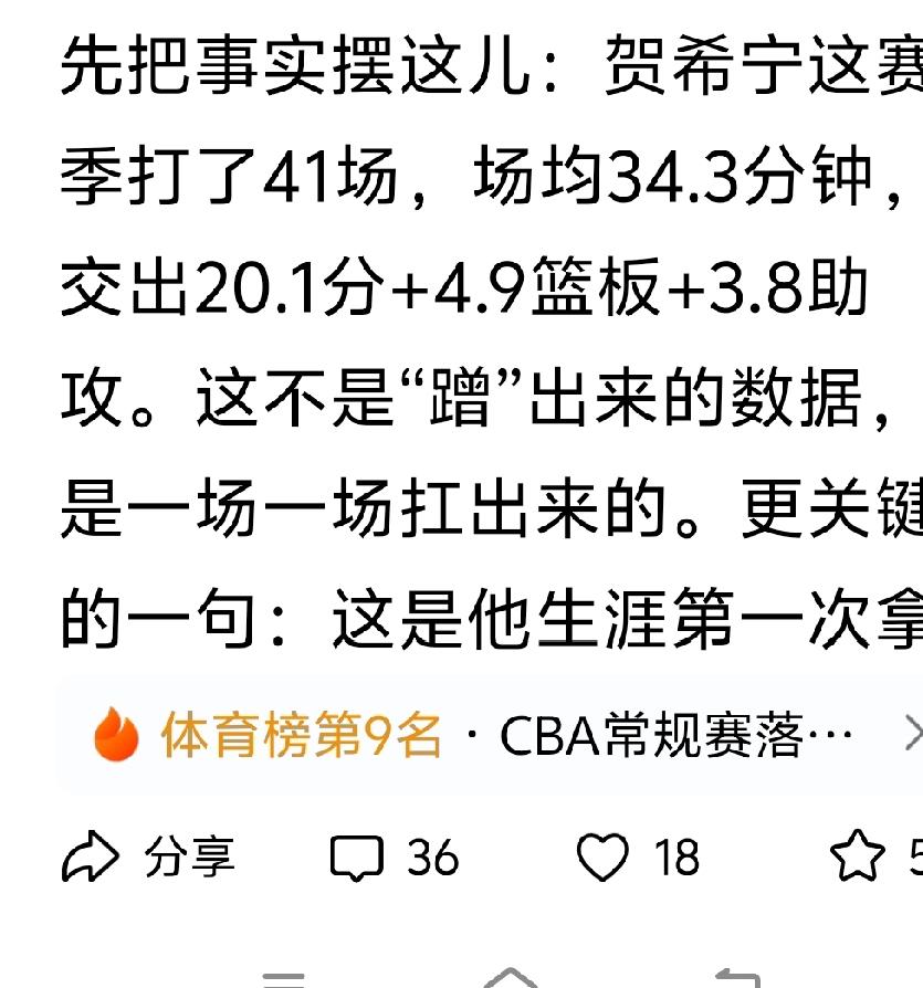 贺希宁真乃大将军也! 贺希宁 获CBA常规赛年度MVP ! 无可争议,官方看数据,什么出场41场、34.3分钟、20.1分4.9篮板3.8助攻。 我看贺希宁一身健壮的肌肉,面沉似水、沉稳大气不与小人斗,用实力说话的品格。 纵观CBA各球队,甚至包括外援打同样位置的队员,要么面黄肌瘦灵性有余对抗不足;要么天生就是投机取巧的配置,别人稍微一认真就原形毕露什么不是;要么所谓装*装暴脾气,用叽叽歪歪整惑别人;有的是窝里横到了国际赛场什么不是;真正的有体能、能对抗、敢对抗、百折不挠而且有高效的得分,状态始终稳定、不怨三怨四的,国内国际赛场一如既往的,唯有“贺希宁大将军”。 因为他的健壮体魄,他的灵性,他的坚韧不拔的毅力,贺希宁会走的很远,会一直关注你!