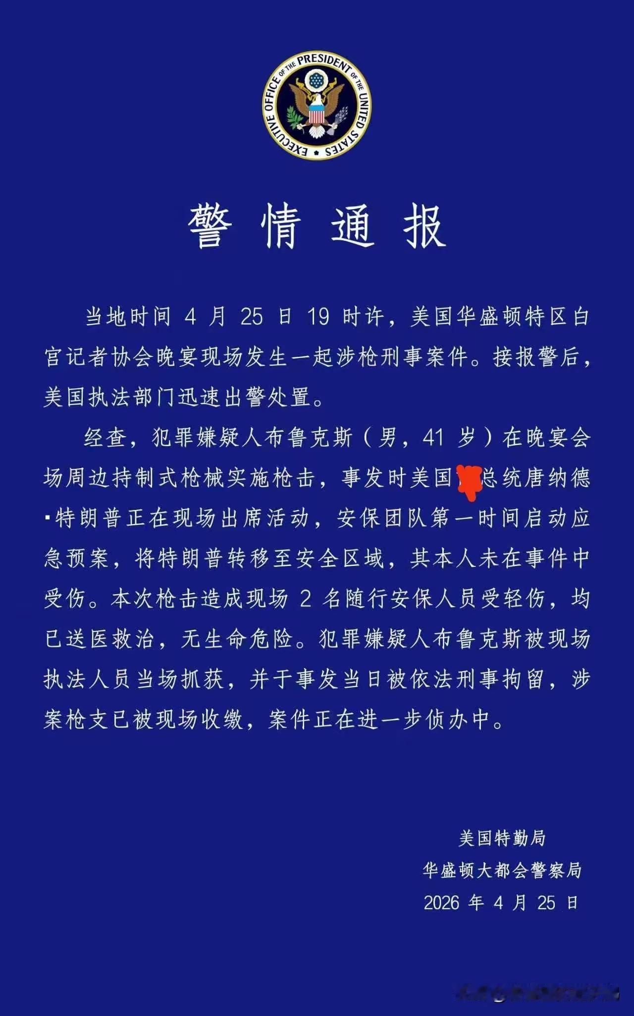 白宫的警情通报,那个涂红居然是个“前”。这肯定是预先写好的,没想到不成功[捂脸] 应该再加上一句:目前所有参加晚宴的人员情绪稳定。请广大吃瓜网友不传谣不信谣一切以白宫通告为准[捂脸]