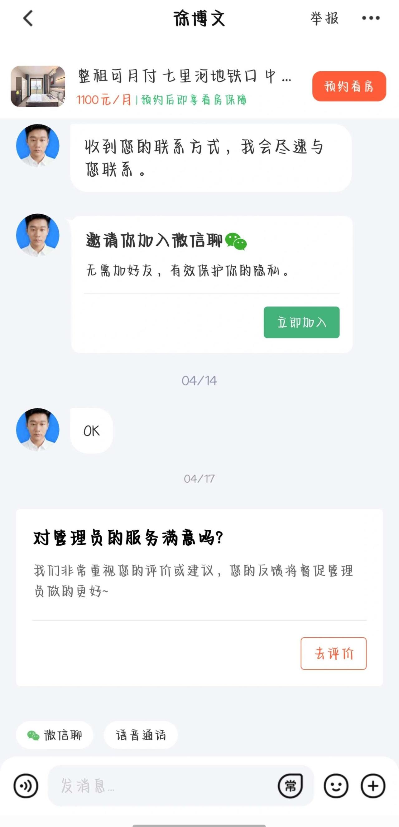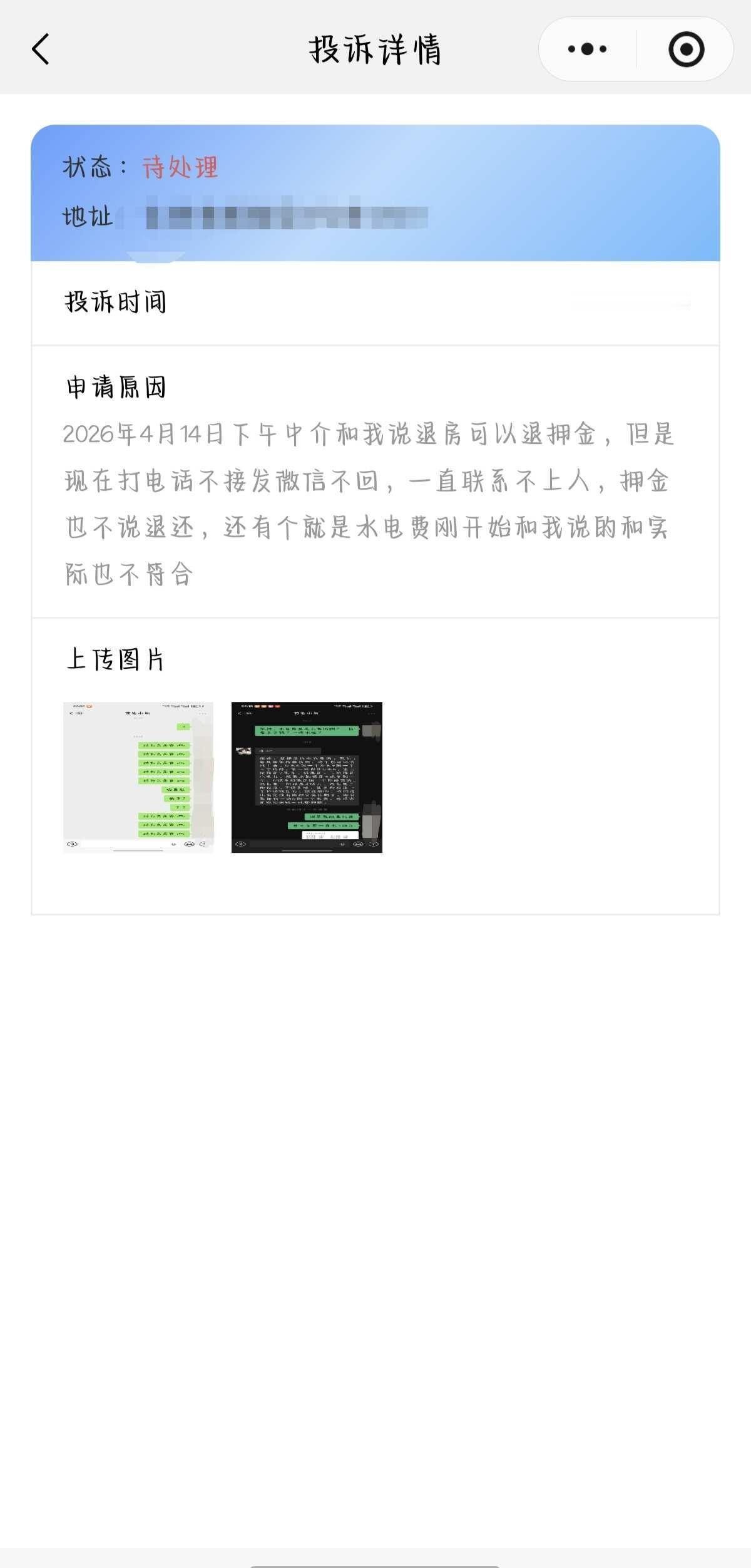 避雷郑州某租房中介 避雷郑州某租房中介,郑州昌嵘房地产经纪有限公司!!! 事情起因:我在58同城找了个租房的图3,他直接让我加微信群,群里负责人私聊我图5,来的是一个骑电动车的瘦瘦、说话挺外向的女生,我成功租下了这房子。让我生气的点在于,其一,水电费和她起初与我聊的时候不一致我便与她争论,最后与房东确认,是这个中介刚开始和我介绍错了,她直接无视我的问题不理人;其二,我在起初租房时就已经明确我是短租,不会太长时间,签合同时看到是一年我也问了她,她明确告诉我中途退租只要提前15天和她说就会退还所有的押金和剩余的水电费,但是后来我和房东聊到这件事时又变成了退一半的押金,因为房东也被骗了中介和他讲的我要长租,我开始和中介理论人家直接不理人装聋作哑了。 图1是我在郑州12345投诉的,图2是我在房租租小程序投诉的,最终都未果。 发出来就是想提醒大家租房避雷这家中介,尤其是在南五里堡地铁口附近的一个骑电动车瘦瘦的中介女生!!! 租房合同 不要被骗了 房租 实习生租房 房产中介 防骗 租房避雷