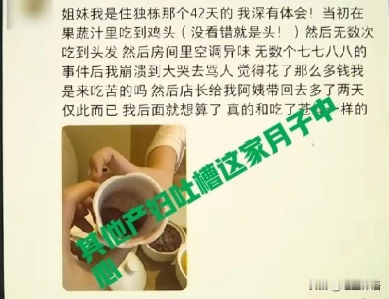 从“女子花23万住月子中心配餐是臭的”说起 4月25日,有媒体采访了浙江杭州一位宝妈周女士。 周女士吐槽自己花19万住某月子中心,“购买”到的服务,却令他大跌眼镜: 卫生条件很差,吃的餐食不适合产妇坐月子口味,甚至餐食是臭的! 果汁里有鸡头(月子中心工作人员回应是鸽子头不小心店里头了)、餐食中多次吃饭头发、室内有异味、床垫发霉(有小虫子),等等。 最恐怖的是,宝宝的婴儿床上,竟然有很多小虫子爬来爬去…… 周女士与月子中心多次沟通无果,于是,忍无可忍的周女士把自己的经历发到网上,吐槽(控诉)月子中心的种种不尽人意之处。 很多产妇在周女士吐槽的内容后留言,接龙吐槽…… @红尘禅语 舆论发酵后,月子中心相关负责人找到周女士,想签所谓“礼赠协议”,里面拟定了给周女士的一些优惠服务,但是,前提是,对月子中心的情况要保密,违者月子中心将罚款2万多。 面对这样的霸王条款,周女士是不可能签署的。 最让周女士闹心的是,宝宝歪脖子、大小脸,而且,宝宝那么小,抵抗力弱,婴儿床上那些虱子在宝宝身上爬来爬去,对宝宝的健康有何影响,目前还不得而知。 周女士的心,整日提到嗓子眼儿了…… 【点评】 1.这家月子中心的卫生条件和服务,太恶心了! 2.花那么多钱,入住这样的月子中心,真的太不值得了! 提醒宝妈们: 不要迷信什么所谓“五星级酒店般服务”的月子中心。 盛名之下,名难符实。 3.推荐: 请金牌月嫂住家服务,按月付费,自己家人(长辈)陪同(监督、监管月嫂的服务情况)。 这种方式,花不多少钱,宝妈和新生儿,会被照顾的很周到。 住月子中心,新生儿不让产妇或家人接触,这是大忌! 对此,您怎么看? (本文信息来源:1818黄金眼)