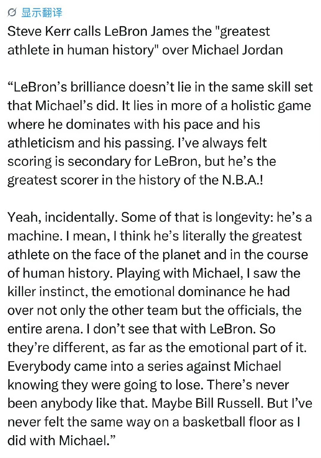 史蒂夫-科尔接受纽约媒体采访:勒布朗-詹姆斯是人类历史上最伟大的运动员,地位超乔丹!