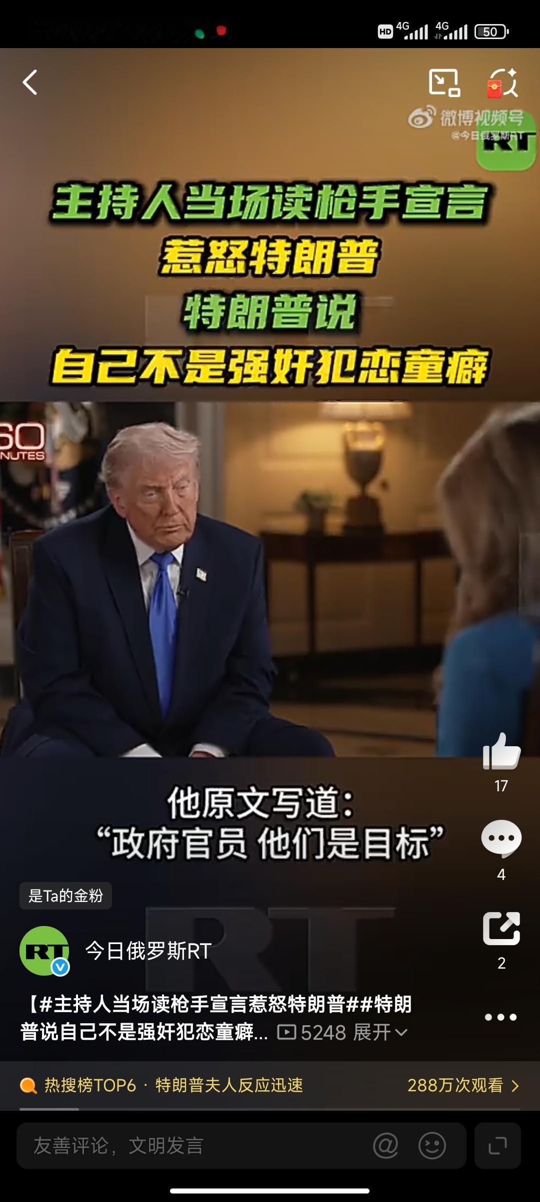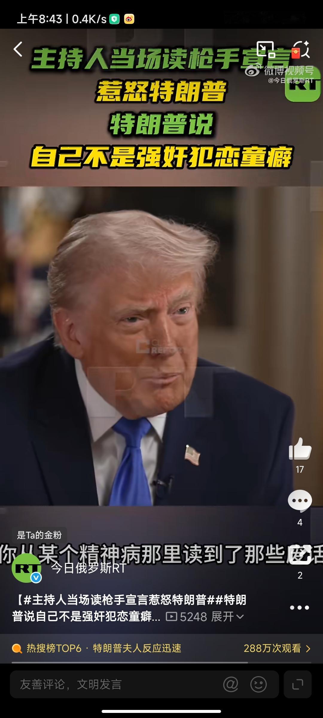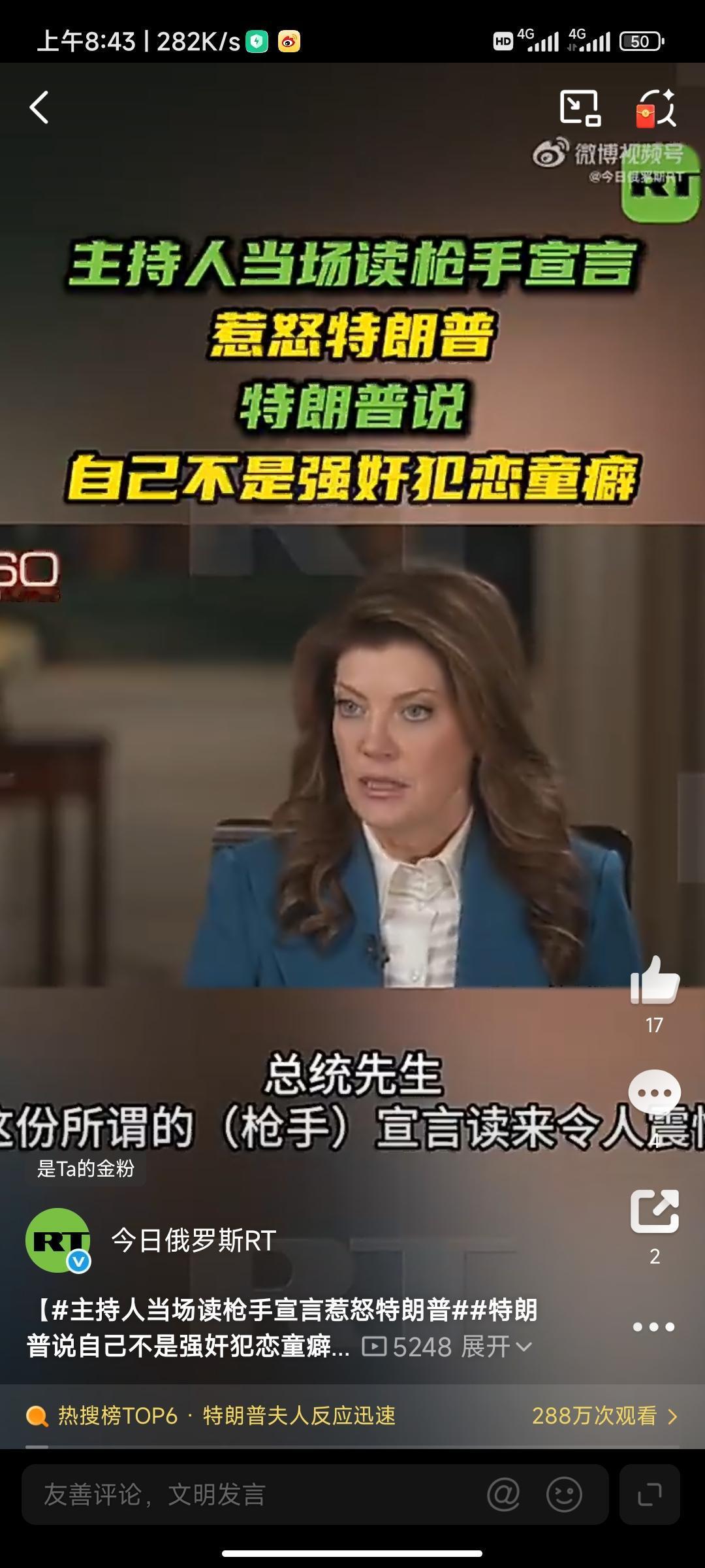暗杀特朗普的枪手宣言: “我再也不愿允许一个恋童癖、强奸犯和叛徒用他的罪行玷污我的双手” 这是昨天暗杀特朗普未遂的枪手写的宣言。 很明显,这就是他的暗杀动机。 然而,特朗普全部否定了上述罪行! 当地时间4月26日,惊魂未定的美国总统特朗普就25日晚白宫记者晚宴枪击事件接受美国哥伦比亚广播公司(CBS)《60分钟》节目采访。 采访中,主持人同着特朗普,公开宣读了这位暗杀特朗普枪手的宣言: “宣言”中,其中一段是“我再也不愿允许一个恋童癖、强奸犯和叛徒用他的罪行玷污我的双手”。 特朗普立即显示出不满和愤怒,他怒道: “我一直在等你读到那段话,因为我知道你会读,因为,你们是群糟糕的人。” 为了为自己辩护,他就枪手的这段宣言立即进行了否定:“我不是强奸犯,我没有强奸任何人。我不是恋童癖。你从某个精神病那里读到了那些废话。我被牵扯进了与我无关的事情里。我已经完全洗清了罪名。” 此前的各项事件,都是有物证或人证的,特朗普称自己已经洗清了罪名,究竟是洗清还是洗白,估计,他卸任后,他的对手和美国的法律不会饶恕罪犯!