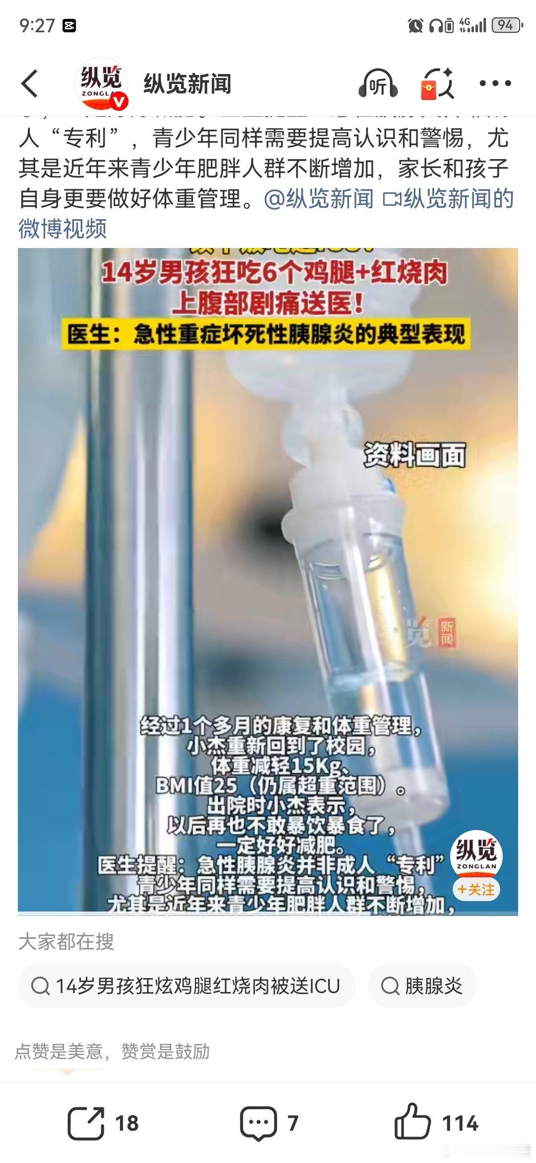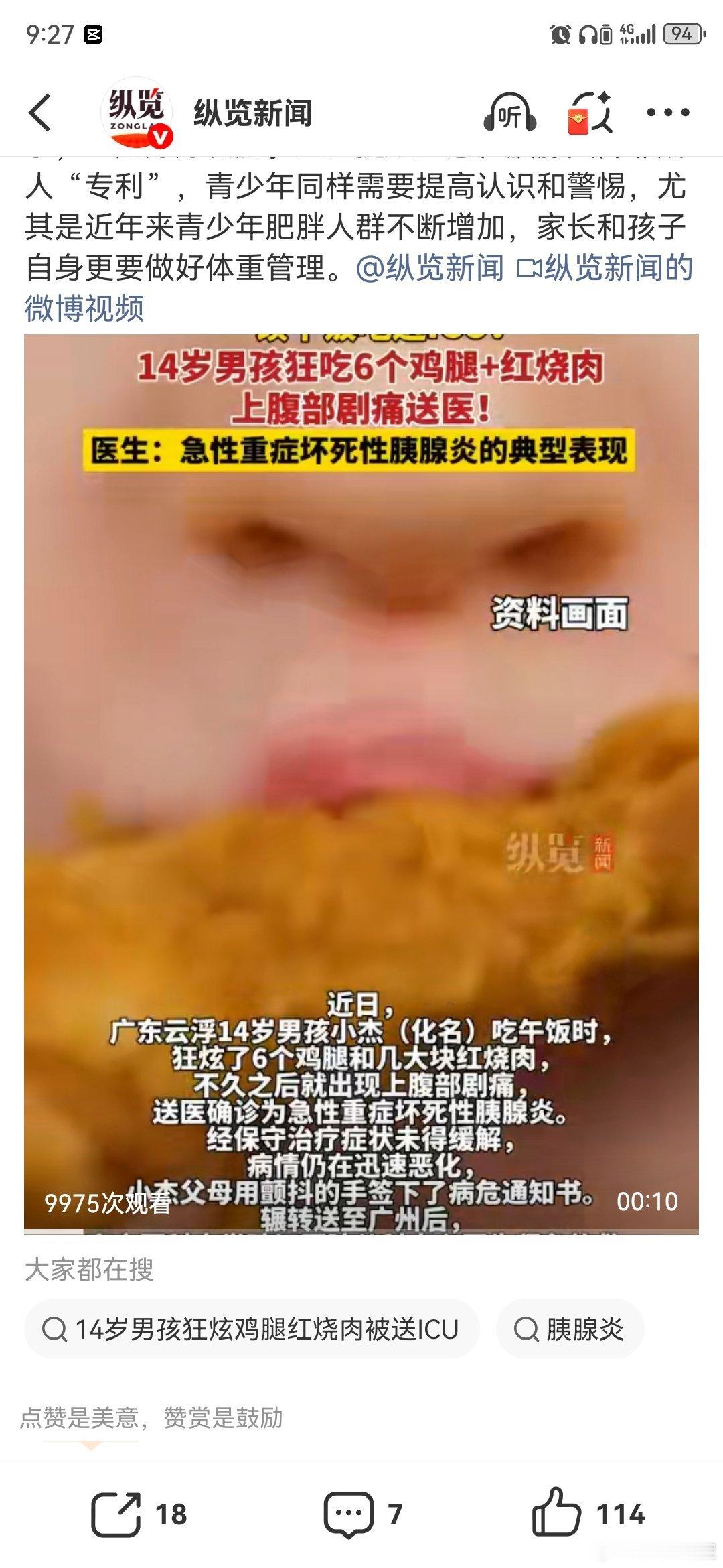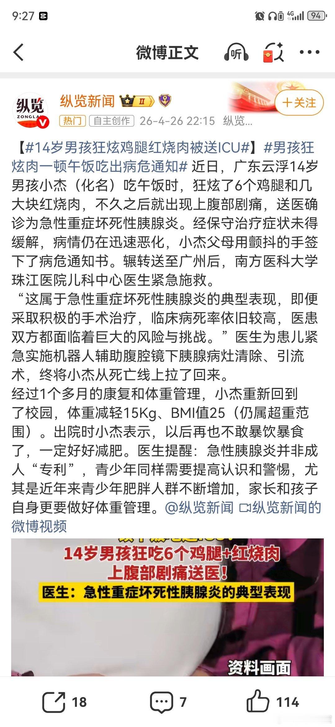 【14岁男孩狂炫鸡腿红烧肉被送ICU】男孩狂炫肉一顿午饭吃出病危通知 据报道,一个14岁小孩狂炫了6个鸡腿和几大块红烧肉,不久之后就出现上腹部剧痛,送医确诊为急性重症坏死性胰腺炎。经保守治疗症状未得缓解,病情仍在迅速恶化,医生为患儿紧急实施机器人辅助腹腔镜下胰腺病灶清除、引流术,终将小杰从死亡线上拉了回来。