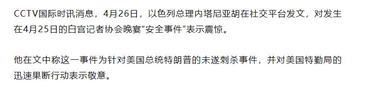 刚刚过去的24小时,足以载入美国史册。以色列总理内塔尼亚胡26日公开发声:对白宫记者晚宴枪击事件“深感震惊”,并定性为“针对特朗普总统的未遂刺杀”。 内塔尼亚胡还代表以色列高层,向美国特勤局的果断行动“表示敬意”,并且专门祝福受伤的警员早日康复。 几乎在同一时间,以色列总统赫尔佐格、外交部长萨尔也纷纷跟上。赫尔佐格把这次袭击称为“卑劣的袭击”,说听到特朗普总统、第一夫人和副总统都没受伤,他“感到宽慰”,还从“圣地”为美国及其领导人的安全祈祷。 外长萨尔说得更直接,他说以色列和美国及特朗普总统“肩并肩站在一起”,用“最强烈的措辞”谴责这起枪击事件,最后斩钉截铁地总结了一句:“对政治暴力零容忍”。 美国出这么档子事,以色列高层为什么反应这么快、这么齐整?这背后可不是简单的客套话。咱们得看看最近这三天的真实情况。枪击案是25号晚上发生的,26号一整天,从白宫到联邦调查局,调查的初步结论就出来了:枪手的目标就是政府官员,很可能包括特朗普本人。 美国代理司法部长布兰奇26号明确说了,嫌疑人目标是政府官员。在这种敏感时刻,任何一个国家的表态,都不只是外交礼仪,更是一种政治站队。 以色列这么急着表态,第一个原因,是特朗普这届政府对以色列确实“够意思”。从承认耶路撒冷为以色列首都,到推动阿拉伯国家与以色列关系正常化,特朗普任内的中东政策明显向以色列倾斜。 内塔尼亚胡和特朗普的私人关系也一直备受关注。现在“金主”兼重要盟友家里出了这么大的事,差点被人“斩首”,于公于私,以色列都必须第一时间、最高规格地表明立场。这声援不仅仅是说给美国听的,也是说给国内和国际社会看的,彰显以美特殊关系的牢固。 第二个原因,是事件本身的性质太恶劣。白宫记者协会晚宴,名义上是媒体和政要的联谊,实际上是美国政治生态的一个标志性场合。枪手选在这里动手,冲击的不是一个酒店,而是美国政治权力的核心象征。 以色列作为一个同样面临复杂安全环境的国家,对这种针对国家元首的政治暴力,有着切肤之痛。他们迅速谴责并划清界限,也是在明确表达一种价值观:无论政治分歧多大,暴力,尤其是针对领导人的暴力,是文明社会的底线,绝不可触碰。 第三个原因,可能更现实一点,涉及到当下的国际局势。就在枪击案发生的同时,英国国王查尔斯三世和王后卡米拉按原计划开始了对美国的国事访问。大国领导人密集互动之际,安全事件会成为焦点中的焦点。 以色列迅速、一致且高调的表态,也是一种精明的外交操作,既表达了关切,也避免了在西方盟友的集体反应中掉队或沉默可能带来的误读。 所以,内塔尼亚胡的一句“深感震惊”,赫尔佐格的一声“卑劣袭击”,萨尔强调的“零容忍”,这三连表态,看似是标准的外交辞令,实则每一句都踩在了点上。这场发生在华盛顿希尔顿酒店的未遂刺杀,震动的不仅仅是美国政坛,也让全球的观察家们,再次看清了国际关系网络中那些清晰或模糊的连线。