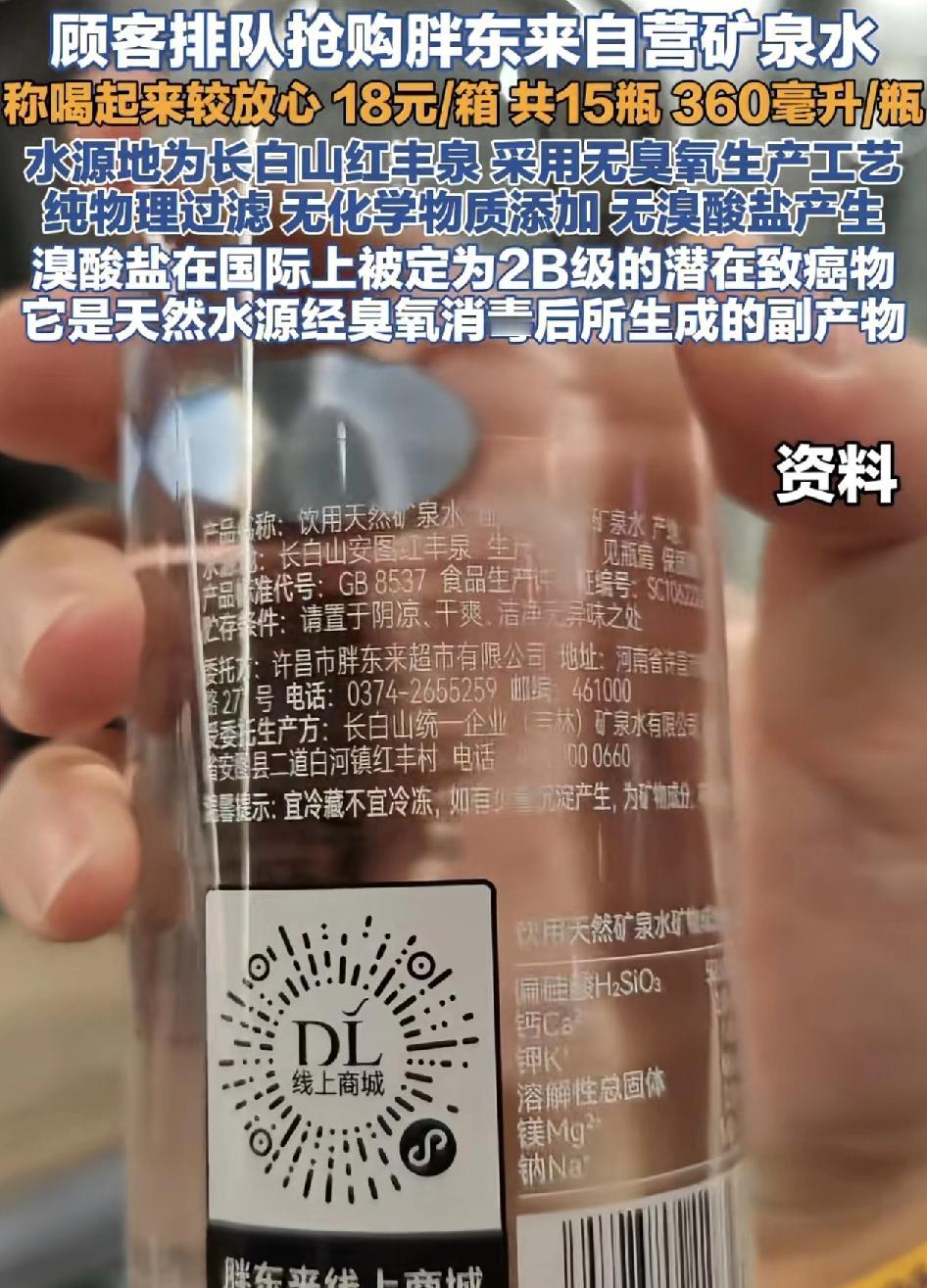 河南许昌胖东来生活超市,不少顾客排队前来抢购自营的矿泉水,该矿泉水,水源来自于长白山红枫泉,采用最精致的生产工艺。无溴酸盐生产,无化学物质添加顾客认为这是喝的最放心的矿泉水,而且价格也不贵,18元一箱,一箱有15瓶,每一瓶360毫升。虽然是简单的一瓶矿泉水,却是让人最放心的水。