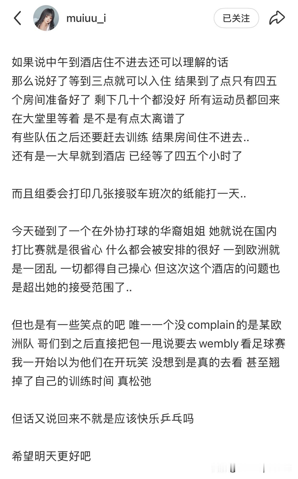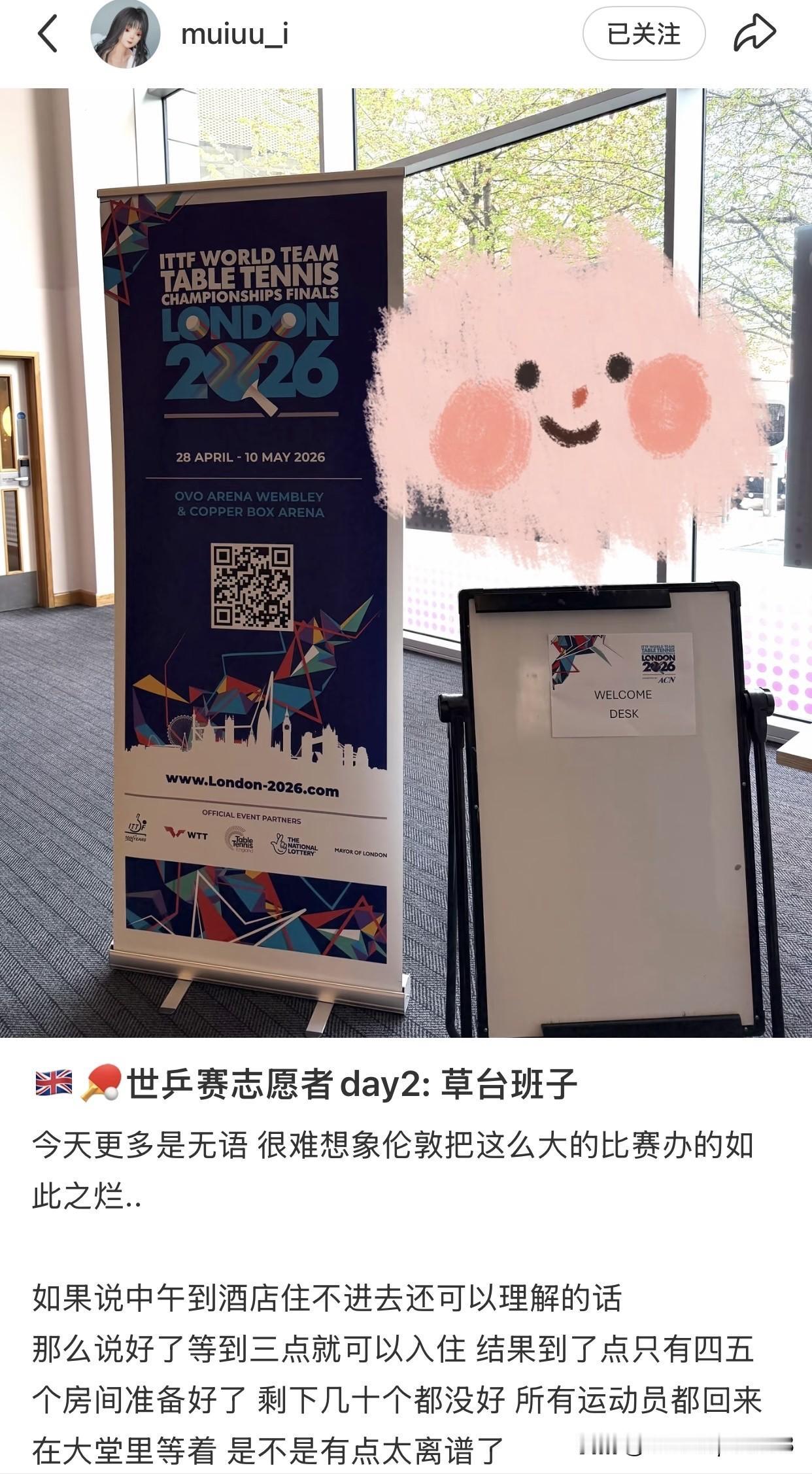 伦敦世乒赛现场志愿者的反馈,酒店的实况,以及需要注意的事项,尤其是财物安全问题。 世乒赛团体赛资格赛在28号下午的5点正式开始, 中国队会在今天从北京出发,28号到达伦敦,因为我们的种子,不需要打资格赛,所以比赛在2号开始。 来自志愿者的反馈,酒店的安排速度很慢,很多队伍训练完了还在等房间, 其实,这种情况在伦敦也很正常。 另外,自己的证件和钱都要分开放好,手机也要保管好。 大家要留出多点的时间,并且要照顾好自己!