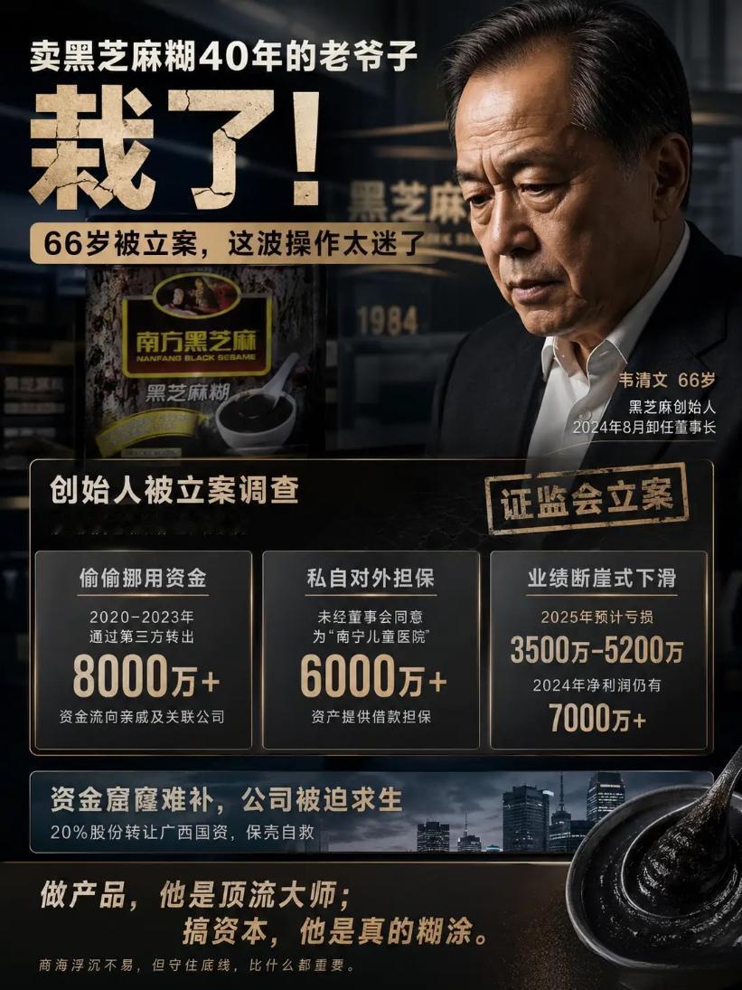 感觉天塌了 南方黑芝麻糊的创始人被立案调查了 是因为信息披露违法,也不知道具体是什么。 我现在就想知道 我上个月买的黑芝麻糊还能不能吃 我最近因为容易饿的快,在办公室都会配一包芝麻糊上班吃,现在家里还剩四五袋,我是该丢了,还是继续吃呢? 我说现在的黑芝麻糊怎么跟以前吃的不一样,以前吃的黑芝麻糊有一股香香的味道,开水一冲,全都融化在水里去了,可是现在买的,好些都会结块,根本就冲不开,难道真的是配方变了吗?
