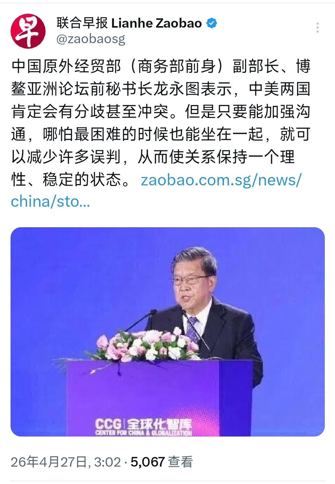 新加坡联合早报今天(4月27日)写道:“中国原外经贸部(商务部前身)副部长、博鳌亚洲论坛前秘书长龙永图表示,中美两国肯定会有分歧甚至冲突。但是只要能加强沟通,哪怕最困难的时候也能坐在一起,就可以减少许多误判,从而使关系保持一个理性、稳定的状态。” [机智]评几句:中美是全球最大的两个经济体。中美关系是全世界最重要的双边关系。合则两利,斗则俱伤。中国懂,不知道美国是不是能够懂?龙永图强调“哪怕最困难时也要坐在一起”,这并非天真,而是止损的底线思维。现实是,美国正将经贸问题高度政治化,试图通过关税战、科技封锁维持霸权。这种“斗”的姿态已让美国企业承受通胀与供应链断裂之苦,也让全球治理陷入困境。中国反复重申“合则两利”,是在提醒美方:战略焦虑不能替代经济理性。如果美方持续将中国视为“必须打压的对手”而非“可合作的伙伴”,最终买单的将是两国消费者和世界经济。