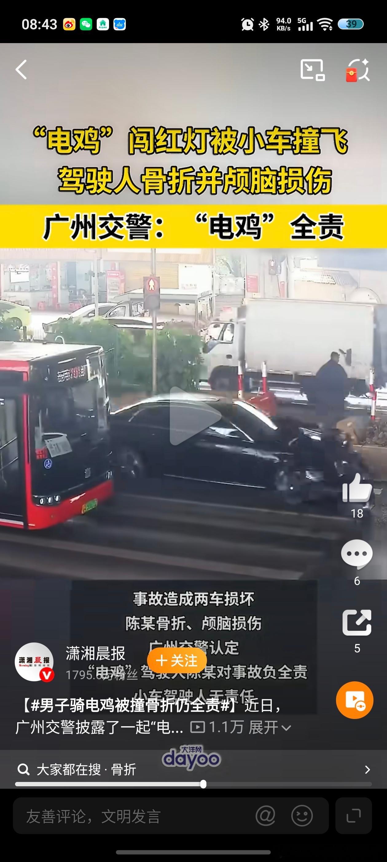 男子骑电鸡被撞骨折仍全责道路千万条,安全第一条。这个肯定骑电动车的全责没跑了,因为违反交通规则,闯红灯被撞纯属活该。就是那个开车的司机太倒霉了,修车还要耽误时间。