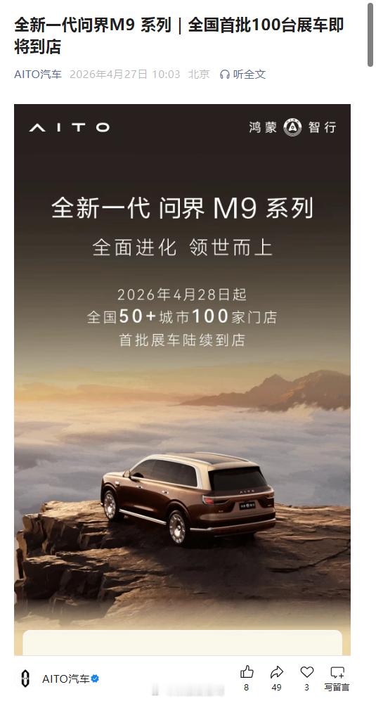 问界 速度来了,全新一代问界m9 全国50多个城市100家门店开始进首批展车了,这速度可以呀!