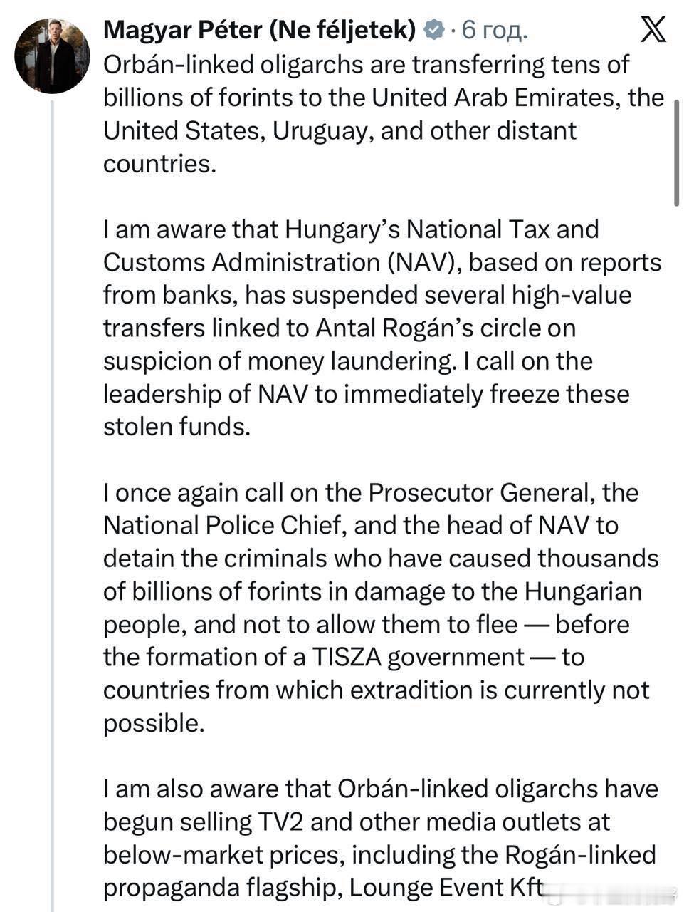 匈牙利新当选总理马扎尔表示:与奥尔班有关的匈牙利寡头正在将几百亿福林转移到阿联酋,美国,乌拉圭以及一些其它国家,匈牙利国家税务和海关管理局NAV根据银行报告已经暂停了几笔与安塔尔·罗根圈子有关的高额转账,我呼吁NAV的高层立即冻结这些被盗资金,我再次呼吁检察总长,国家警察局长以及NAV负责人拘留那些给匈牙利人民造成几千亿福林损失的罪犯,并且不要允许他们在新政府成立前逃往目前无法引渡的国家,我知道,与奥尔班有关的寡头已经开始以低于市场价出售TV2和其它媒体,包括与罗根有关的宣传旗舰,Lounge Event公司。